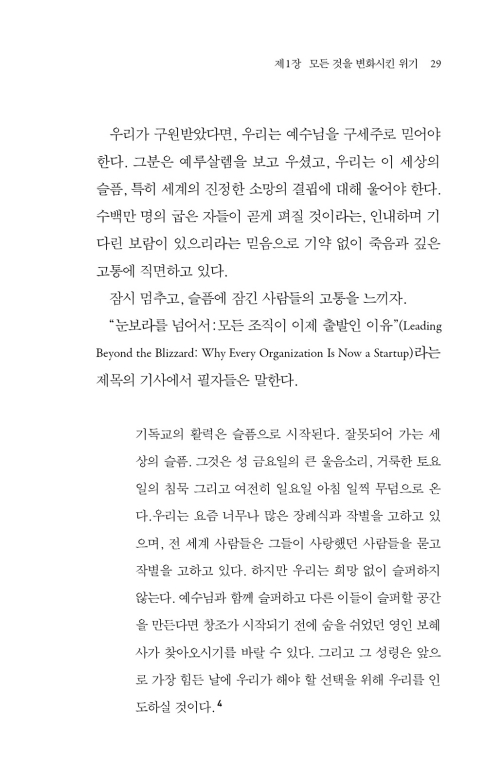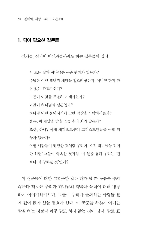 나는 팬데믹과 자연재해로부터 배워야 할 교훈을 말할 때, 하나님이 왜 이런 참화를 세상에 보내시는지, 그 이유를 제시하려는 것은 아니다. 궁극적인 참된 이유는 하나님만이 아시며, 세부 사항을 밝히기에 적합하지 않다고 생각한다. 나는 이 교훈이 외로움과 고통을 겪는 사람들에게 즉각적인 위로를 가져다줄 것이라는 암시라도 주고 싶은 마음은 없다. 하나님이 질병이나 재앙을 보내신 이유를 모두 알고 있다고 하더라도 상실과 슬픔의 아픔을 완전히 없앨 수 없음을 솔직하게 인정한다. 예수님이 실로암 망대가 무너져 18명이나 되는 사람들이 죽었다는 이야기를 하시며, 인간의 비극에 관한 질문에 대한 힌트를 주셨다.