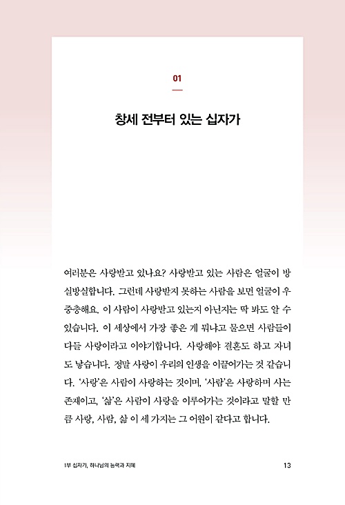 하나님께서 우리에게 그 놀라운 하나님의 사랑을 잴 수 있는 자를 주셨는데 그것이 바로 ‘십자가’입니다. 이 십자가 안에 하나님의 사랑이 담겨 있습니다. 이 십자가의 사랑을 진짜 깨달으면 하나님의 사랑을 감격적으로 느낄 수 있다는 것입니다. -16p