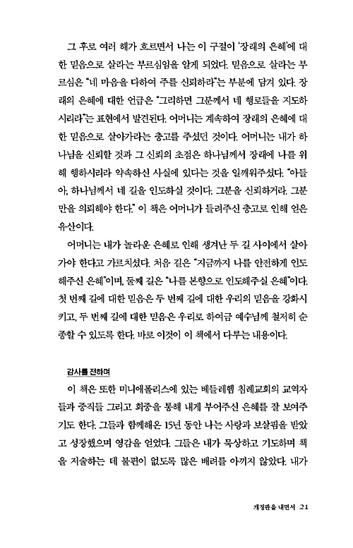 내 생애에는 이제 장래에 펼쳐질 삶만 남아 있다. 나는 더 이상 과거의 삶에 영향을 미치거나 바꿀 수 없다. 이미 지나간 날들이다. 하나님도 과거를 변화시키지 않으실 것이다. 하나님에 대한 모든 기대는 장래에 대한 기대다. 믿음과 사랑에 관련된 모든 가능성들도 장래에 속한 것이다. 그리고 사랑 안에서 살아가도록 나를 돕기 위해 다가오는 모든 능력들도 장래의 능력이다. 지나간 하나님의 복들이 매우 소중하지만, 하나님께서 과거의 기억만을 내게 남겨놓으시고 더 많은 축복에 대한 약속을 주시지 않는다면, 아마 나는 어찌할 바를 몰라 당황할 것이다. 장래의 선하심과 장래의 영광을 갈망하는 나의 마음은 장래의 은혜에 대한 소망으로 나타난다. (p. 115)