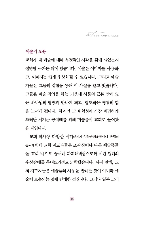 따라서 우리가 기독교인으로서 십자가나 그림 동화나 찬양대나 전도용 연극으로만 예술을 제한할 필요가 없습니다. 이런 단순한 형태의 예술도 교회 안에서 그 역할을 하겠지만, 하나님께서는 모든 예술이 예술적 잠재력을 충만히 꽃피우기를 원하십니다. 54-55p