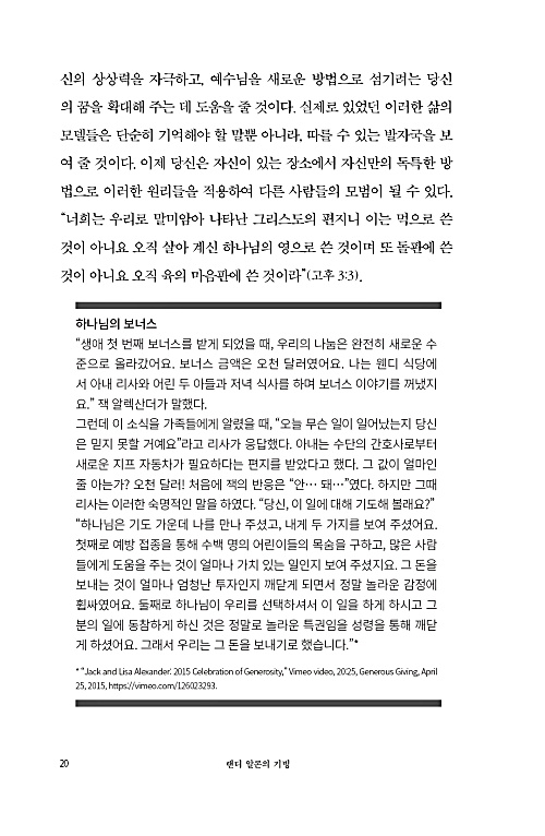 나눔은 그것을 받는 사람의 삶을 변화시키므로 이것만으로도 나누어야 할 충분한 이유가 된다. 아울러 나눔은 나누는 사람의 마음을 다시 집중시켜 천국에 투자하게 함으로써 삶을 아름답고 풍요롭게 만든다. 이렇게 함으로써 나눔은 하나님께서 우리를 위해 의도하신 멋진 삶을 살아갈 수 있는 힘을 우리에게 준다. _275쪽