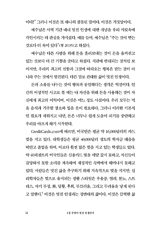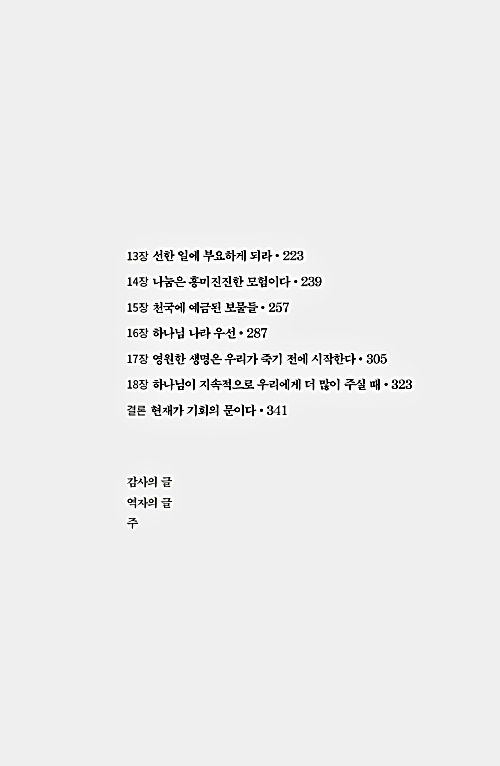 하나님이 우리를 부르신 삶은 낮은 차원의 즐거움을 부인하는 것이라기보다는 더 큰 즐거움을 누리는 것이다. 가장 큰 즐거움은 그리스도를 따르는 것이며, 그분께 영광을 올려드리는 것이며, 다른 사람을 사랑하고 돌보는 것이며, 이 모든 좋은 것들을 주신 하나님 안에서 기쁨을 발견하는 것이다. 다른 사람의 유익과 하나님의 영광을 위해 한 일이 또한 하나님의 놀라운 계획 안에서 현재와 그리고 영원히 우리 자신의 행복을 위한 기초가 됨을 아는 것은 얼마나 놀라운 일인가! _302쪽