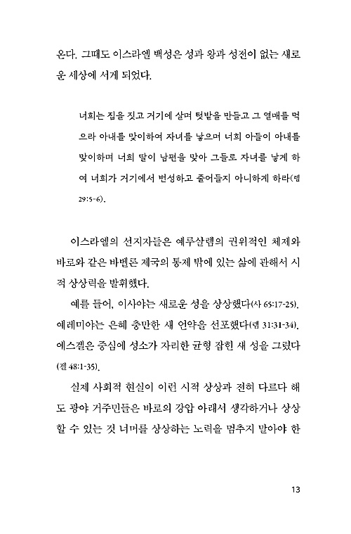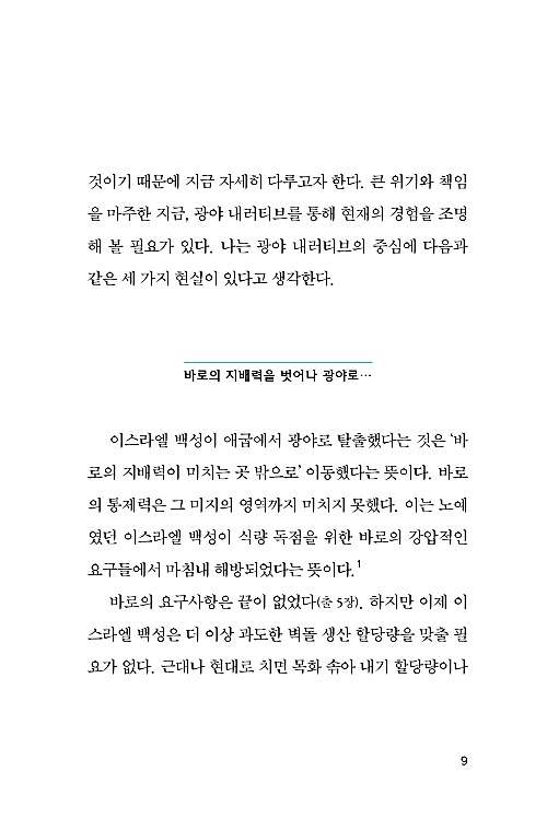 ‘취약성’과 ‘삶의 터전 밖으로 쫓겨남’, ‘분노와 두려움’이라는 이 안타까운 사회적 현실에 관해서 생각하던 중 성경에도 비슷한 상황이 있다는 사실이 떠올랐다. 즉 이스라엘 백성이 애굽을 떠나 광야를 헤매던 상황이 이와 비슷하다. 그래서 이 위기 속에서 성경의 광야 내러티브를 살펴보는 것이 바람직하다고 판단했다. 이어지는 장들에서 광야 내러티브를 언급하기는 하겠지만 직접적으로 다루지는 않을 것이기 때문에 지금 자세히 다루고자 한다. 큰 위기와 책임을 마주한 지금, 광야 내러티브를 통해 현재의 경험을 조명해 볼 필요가 있다.