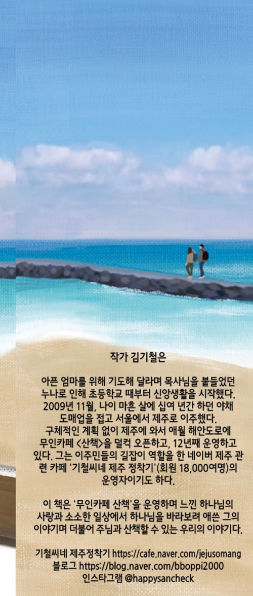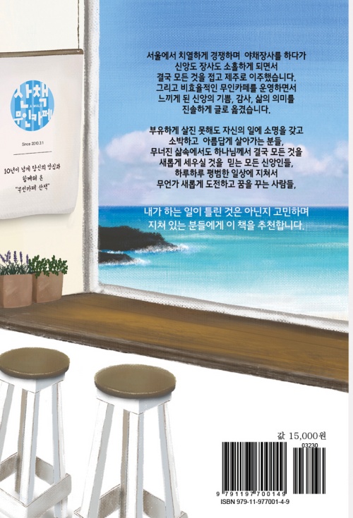 이 책의 저자는 12년째 제주도에서 무인카페를 운영하고 있습니다. 서울에서 치열하게 경쟁하며 야채장사를 하다가 신앙도 장사도 소홀하게 되면서 결국 모든 것을 접고 제주로 이주해서 그와 반대로 비효율적인 무인카페를 운영하면서 느끼게 된 신앙의 기쁨, 감사, 삶의 의미를 이야기하고 있습니다. 그와 마찬가지로 어려움이 있지만 자신의 일을 소명이라고 여기고 생각하는 분들이 많이 있을 것입니다. 그분들에게 힘이 돼 줄 책이라고 생각합니다.