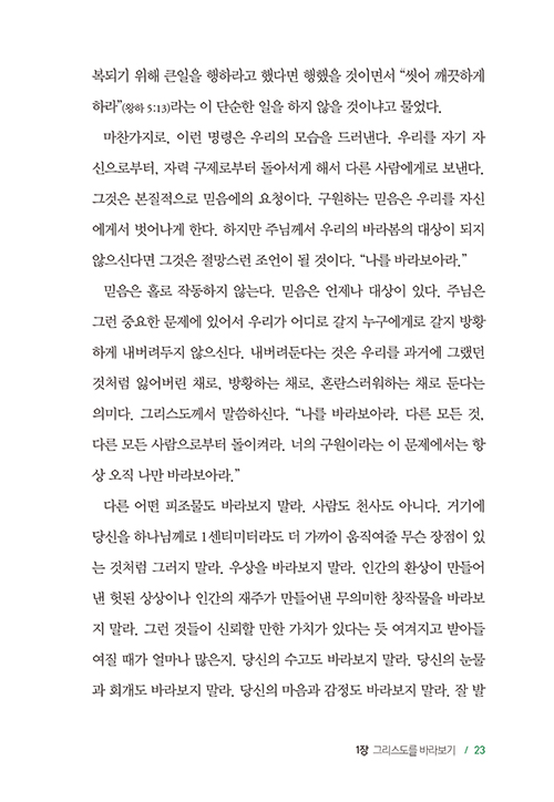 당신의 수고도 바라보지 말라. 당신의 눈물과 회개도 바라보지 말라. 당신의 마음과 감정도 바라보지 말라. 잘 발휘되고 있는 당신의 장점과 은사도 바라보지 말라. 당신이 지키는 종교적인 의식도 바라보지 말라. 거룩한 연회와 축제도 바라보지 말라. 이스라엘의 거룩한 분께 용납되기 위해 당신의 의, 당신의 노력을 바라보지 말라. 그것은 당신에게 자격을 부여해주지 않는다. 어떤 의미에서 죄만이 우리에게 필요한 유일한 자격조건인데, 그것은 우리가 끔찍이도 충분히 갖고 있는 것이다.