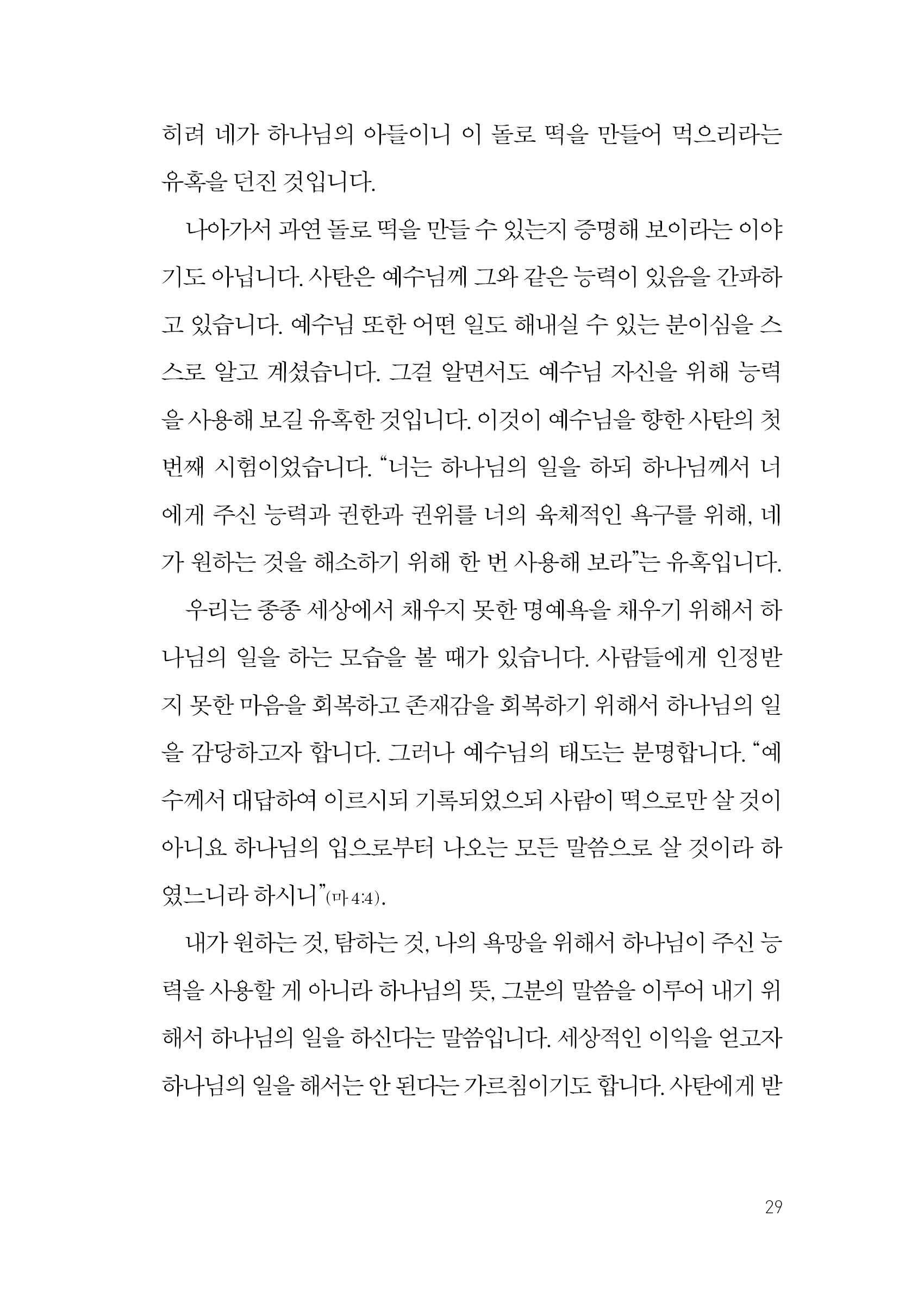 하나님은 예수님의 모범을 통해서 새로운 사역을 시작하려는 이들이 갖추어야 할 덕목을 말씀해 주십니다. 첫째로 주님의 사역을 감당하려는 사람은 자신을 위해 일하지 않아야 합니다. 자신의 명예와 욕구를 충족하는 일에 권력과 능력을 사용하지 않아야 합니다. 둘째로 주님의 사역을 감당하려는 사람은 영웅적인 방식으로 일하지 않습니다. 기적도 필요하지만 상식과 질서도 중요합니다. 하나님께서 만들어 놓으신 자연의 질서 역시 하나님의 뜻이 담겨 있는 교과서입니다. 이 사실을 인정하며 상식적이고 이치에 맞게 하나님의 일을 해야 합니다. 셋째로 주님의 사역을 감당하려는 사람은 방법과 방식에 대해 늘 깊이 고민해야 합니다. 이것이 정말 하나님을 예배하는 일인가, 하나님께 영광을 돌리는 방법인가를 물어야 합니다. 어떤 방식으로든 어떤 방법으로든 사탄에게 절해서라도 목적만 이루면 된다는 생각은 하나님의 사람이 가져야 할 태도가 결코 아닙니다. 하나님께 영광을 돌리는 방법을 찾아 나갈 때 하나님의 사역은 진정 올바르게 이루어질 수 있습니다.