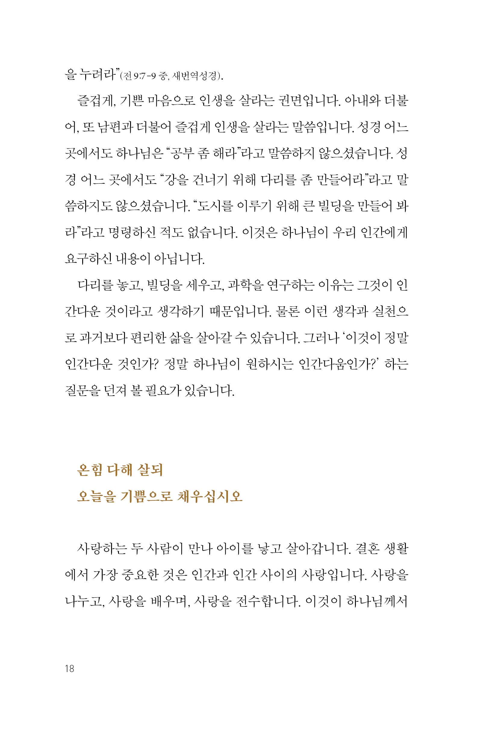 수고하고 애쓰며 살아가는 것은 현대인의 숙명과 같다. 직장인뿐 아니라 각자의 자리에서 최선을 다하는 그리스도인들 역시 비슷하다. 맡은 사명을 다하고자 안간힘을 쓰며 노력하는데 허탈감과 무력감, 성과 없는 고단함이 사명을 갉아먹고 있음을 발견하게 된다. 어디서부터 잘못된 것일까, 방법이 틀렸나 돌아보아도 뾰족한 답은 없다. 열매 없는 최선과 노력하는 삶의 허무함을 해석할 지혜가 없다. 하나님이 왜 유한한 인간에게 최선을 다하는 삶을 살라고 하시는지 그 섭리를 아는 것이 필요하다.