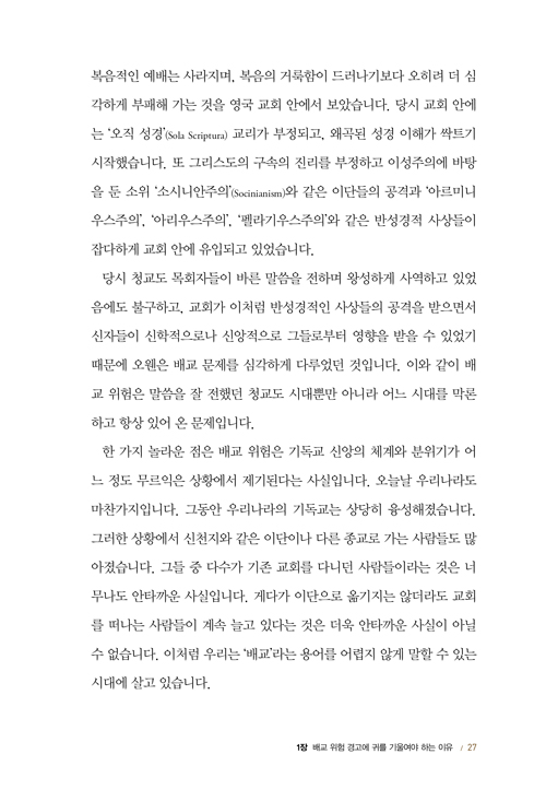배교 위험 경고를 알리는 5가지 자가 진단 질문에 답해 보라. 만약 여기에 하나라도 해당된다면 당신은 이 책을 반드시 손에 들고 끝까지, 마지막 한 글자까지 읽어야 하는 바로 그 사람일 수 있다.