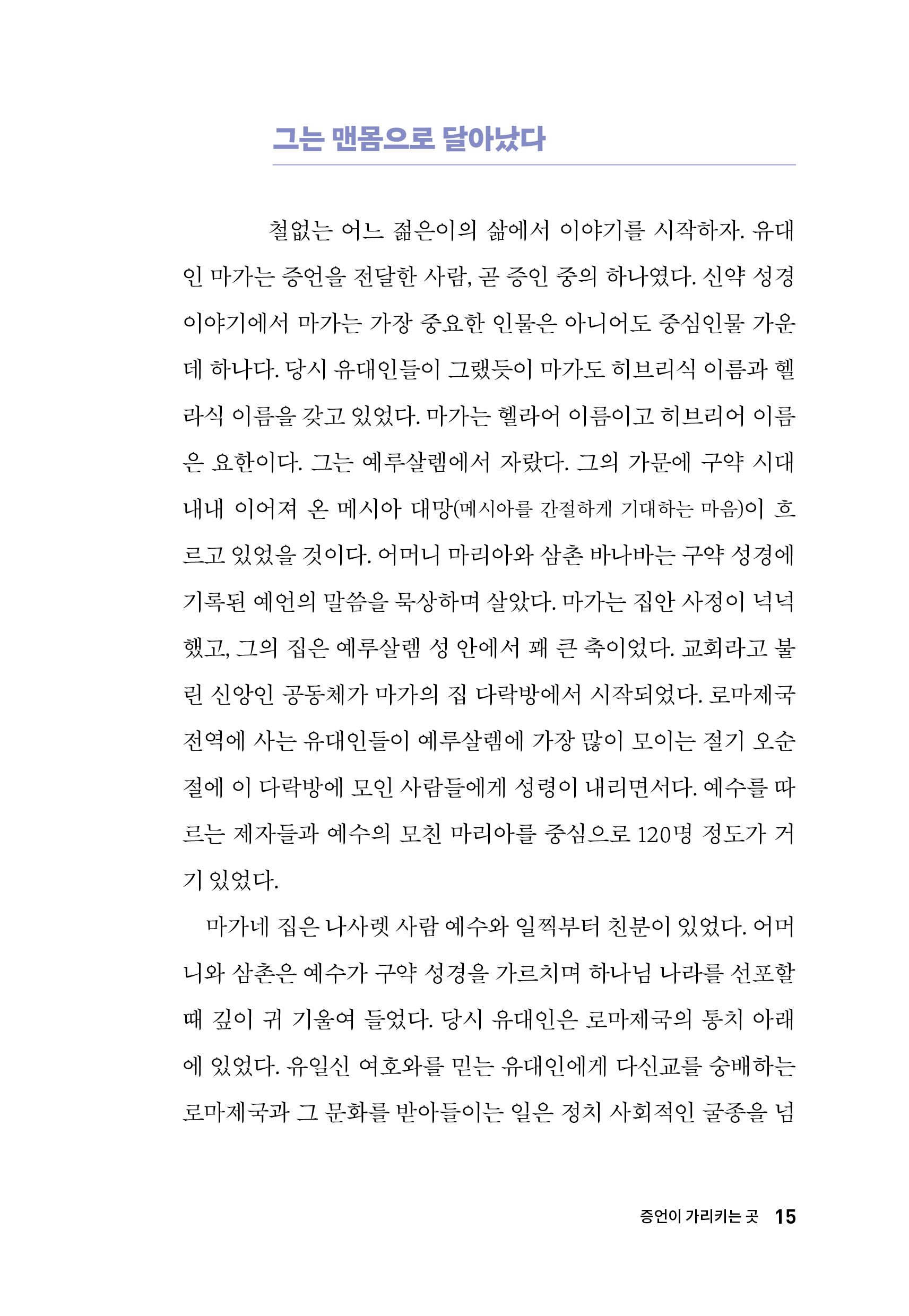 그들은 그렇게 그 시대에 예수, 또 그가 전한 메시지를 전하는 ‘증거자’가 되어. 예수의 삶과 죽음, 부활과 승천을 전하며 세상에 교회를 등장시켰다. 그리고 교회가 된 그들은 로마치하에서 벌어졌던 갖은 고난과 사람들 사이의 갈등을 극복해냈다. 그들은 특별하지 않았다. ‘성인(聖人)’이라기 보다는 ‘증인(證人)’이었다. 보고 들은 것을 말하지 않을 수 없었고, 그들이 보고 듣고 만났던 예수의 말씀은 ‘삶의 근본적인 변화’를 요청했기에 그대로 살아내려 애썼을 뿐이다.