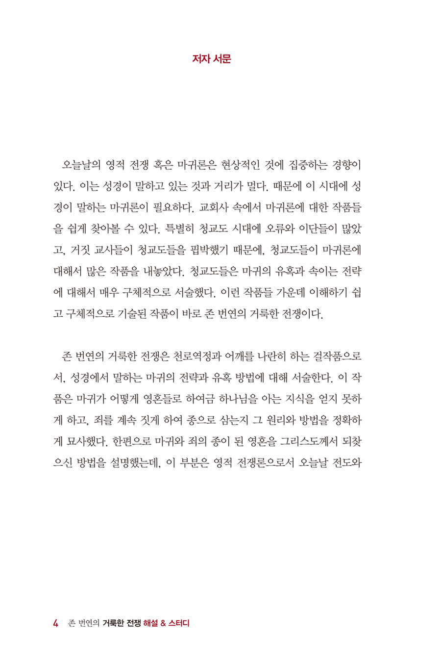 구원에 관한 역사적 서술과 구원의 체험 속에서 인간 내면에 일어나는 실제적 체험을 성경적으로 설명하는 책이 바로 거룩한 전쟁입니다. 그러나 풍유법을 사용하여 구원의 역사를 서술하였기 때문에 그냥 책을 읽어서는 이해하기가 어렵습니다. 이 책은 거룩한 전쟁의 심층 강해서로서 독자들이 책을 이해하는 데 좋은 길잡이가 될 것입니다.