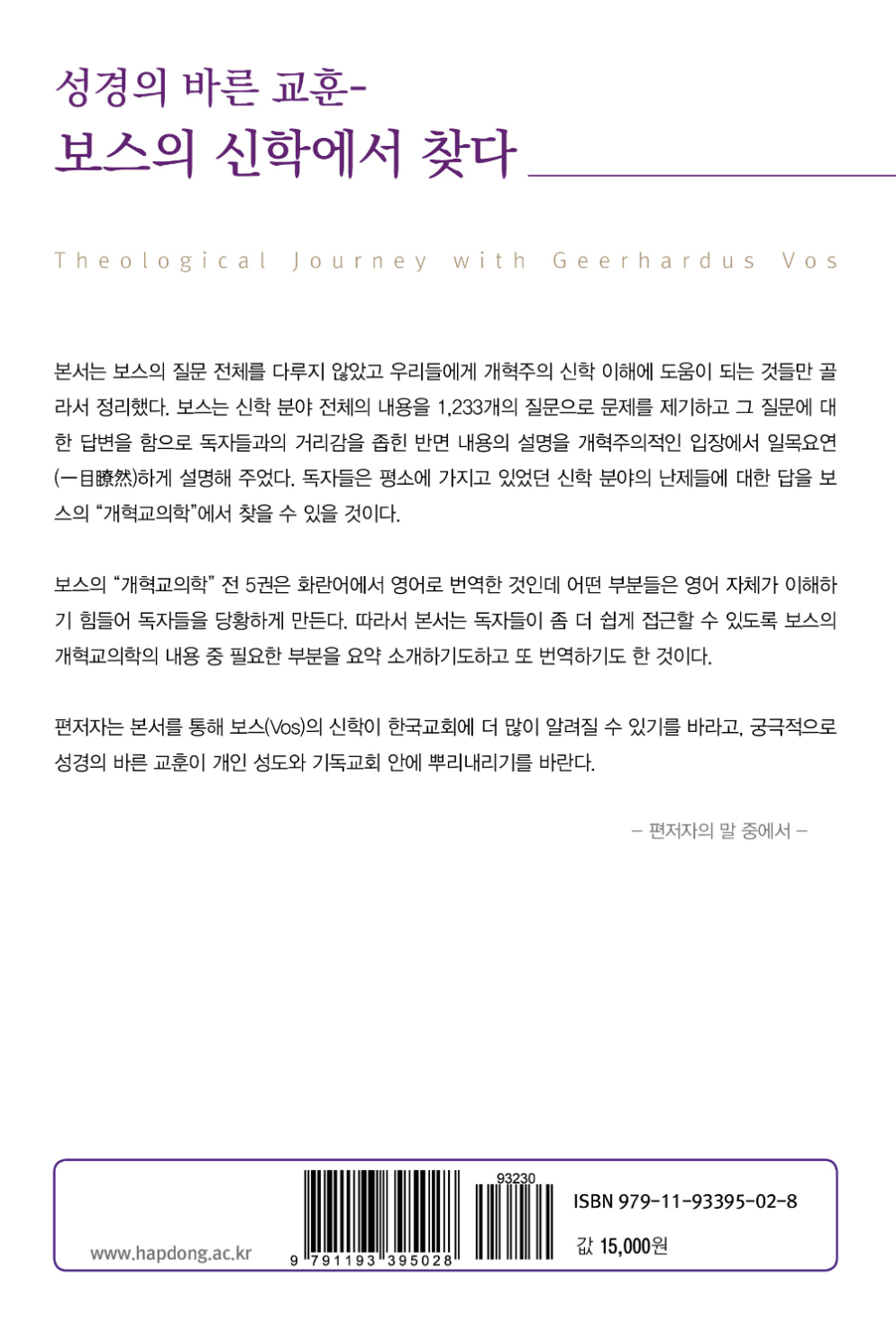 편저자는 본서를 통해 보스(Vos)의 신학이 한국교회에 더 많이 알려질 수 있기를 바라고, 궁극적으로 성경의 바른 교훈이 개인 성도와 기독교회 안에 뿌리내리기를 바란다.