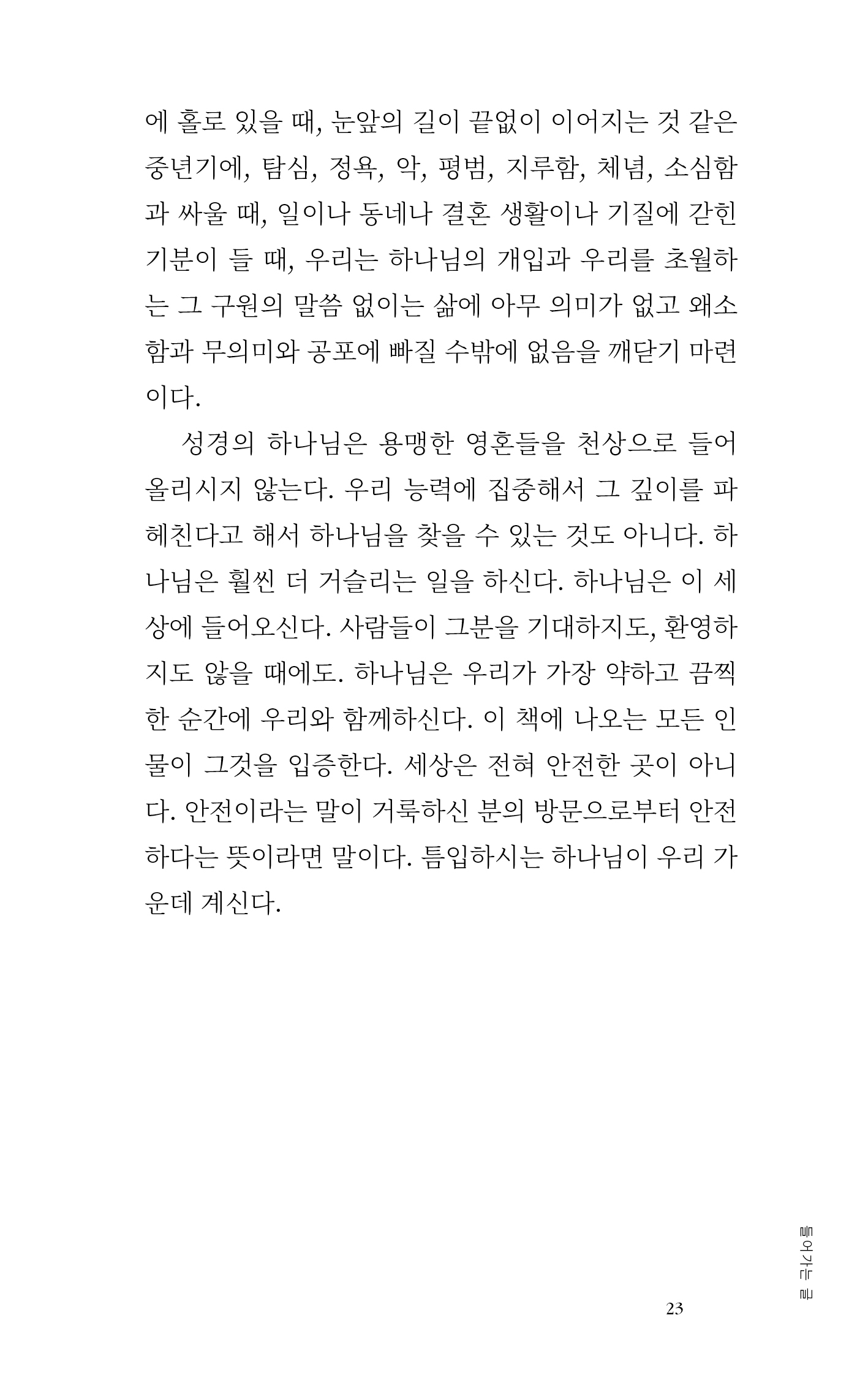 성경의 하나님은 용맹한 영혼들을 천상으로 들어 올리시지 않는다. 우리 능력에 집중해서 그 깊이를 파헤친다고 해서 하나님을 찾을 수 있는 것도 아니다. 하나님은 훨씬 더 거슬리는 일을 하신다. 하나님은 이 세상에 들어오신다. 사람들이 그분을 기대하지도, 환영하지도 않을 때에도. 하나님은 우리가 가장 약하고 끔찍한 순간에 우리와 함께하신다. 이 책에 나오는 모든 인물이 그것을 입증한다. 세상은 전혀 안전한 곳이 아니다. 안전이라는 말이 거룩하신 분의 방문으로부터 안전하다는 뜻이라면 말이다. 틈입하시는 하나님이 우리 가운데 계신다.