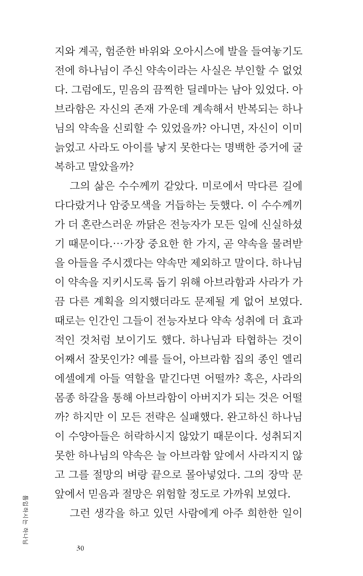 하나님은 사라가 장막 뒤에서 얼마나 괴로운지 아신다. 물론 웃음소리가 났지만, 그 아래서 빗발치고 있는 실망과 쓰디쓴 마음에도 귀 기울이신다. 하나님은 사라를 책망하셔야 마땅할 텐데, 놀랍게도 그녀를 꾸짖지 않으시고 한 가지 질문을 던지신다. “여호와께 능하지 못한 일이 있겠느냐?”라는 이 질문에 그녀의 존재가 걸려 있다. 이 모든 상황에도, 사라는 하나님을 신뢰할 수 있을까? 거의 2천 년 후에 갈릴리 어느 마을에서, 사라보다 어리고 결혼도 하지 않은 다른 한 여성이 메시아의 어머니가 된다는 메시지를 받게 된다. 마리아가 믿음의 문제와 싸우고 있을 때 하나님은 같은 말씀을 반복하신다. “대저 하나님의 모든 말씀은 능하지 못하심이 없느니라”(눅 1:37).