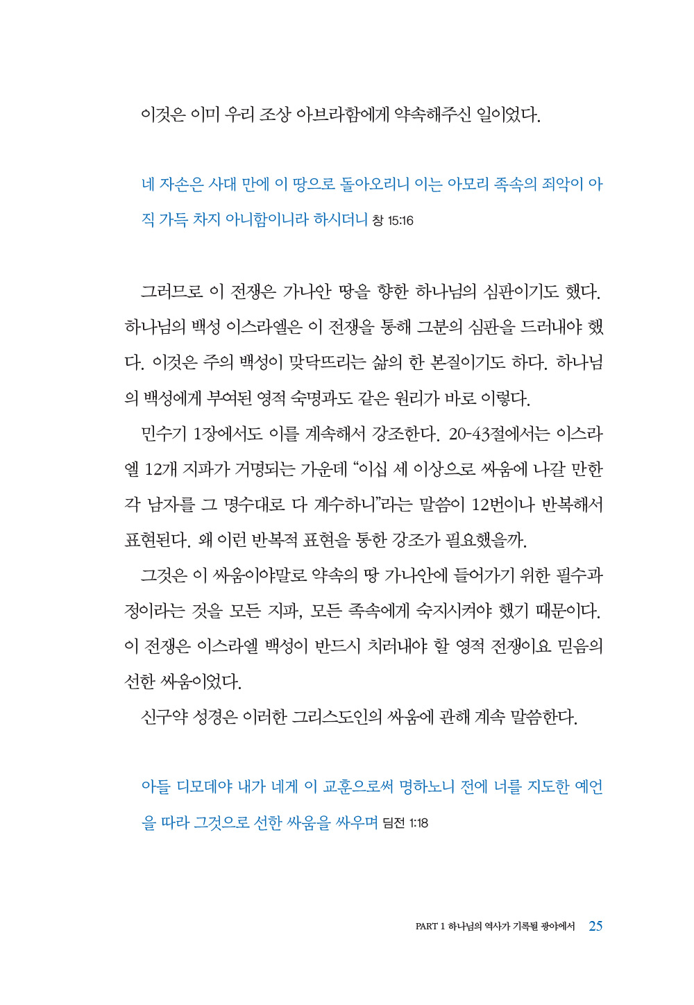 민수기의 가장 분명한 메시지는 출애굽 백성의 광야 고생담이 아니라 십자가다. 광야에서 자신의 고난만 바라보면 답이 없다. 광야 여정에 나타난 그리스도를 발견하고 그분과 나의 아름다운 관계를 깨달아야 자신의 정체성이 분명해진다. 그리고, 하나님의 백성으로서 어떻게 살아야 하며, 어떻게 광야 여정을 행복한 결말이 되게 할지 알게 된다.