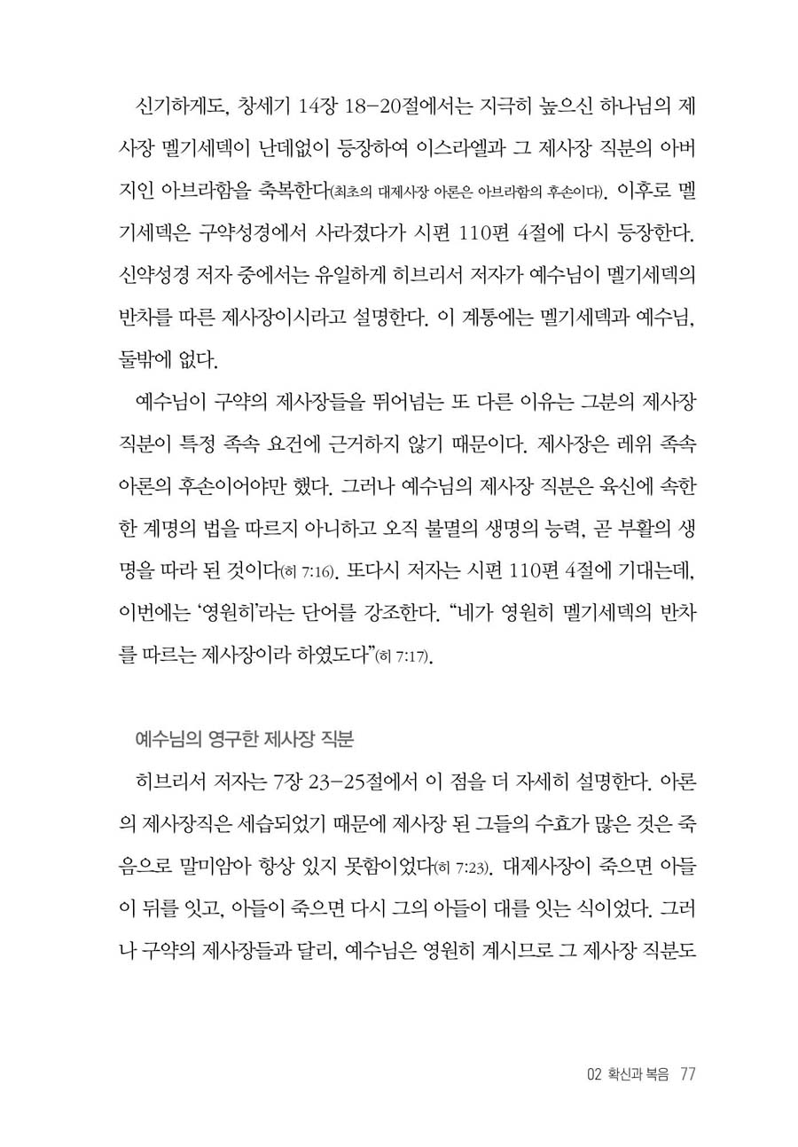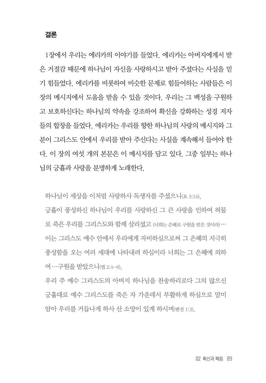 [전략] 구원의 확신은 최종 구원에 대한 그 사람의 자신감을 뜻한다. 거의 모든 신자들은 그리스도인의 삶 어느 시점에서 구원의 확신 문제로 어려움을 겪는다. 어쩌면 당신도 지금 그 문제로 씨름하고 있을지 모른다. 아니면 이 문제 때문에 괴로워하는 가족이나 친구를 알고 있을 수도 있다. 그렇다면 이 책은 바로 당신을 위한 책이다.