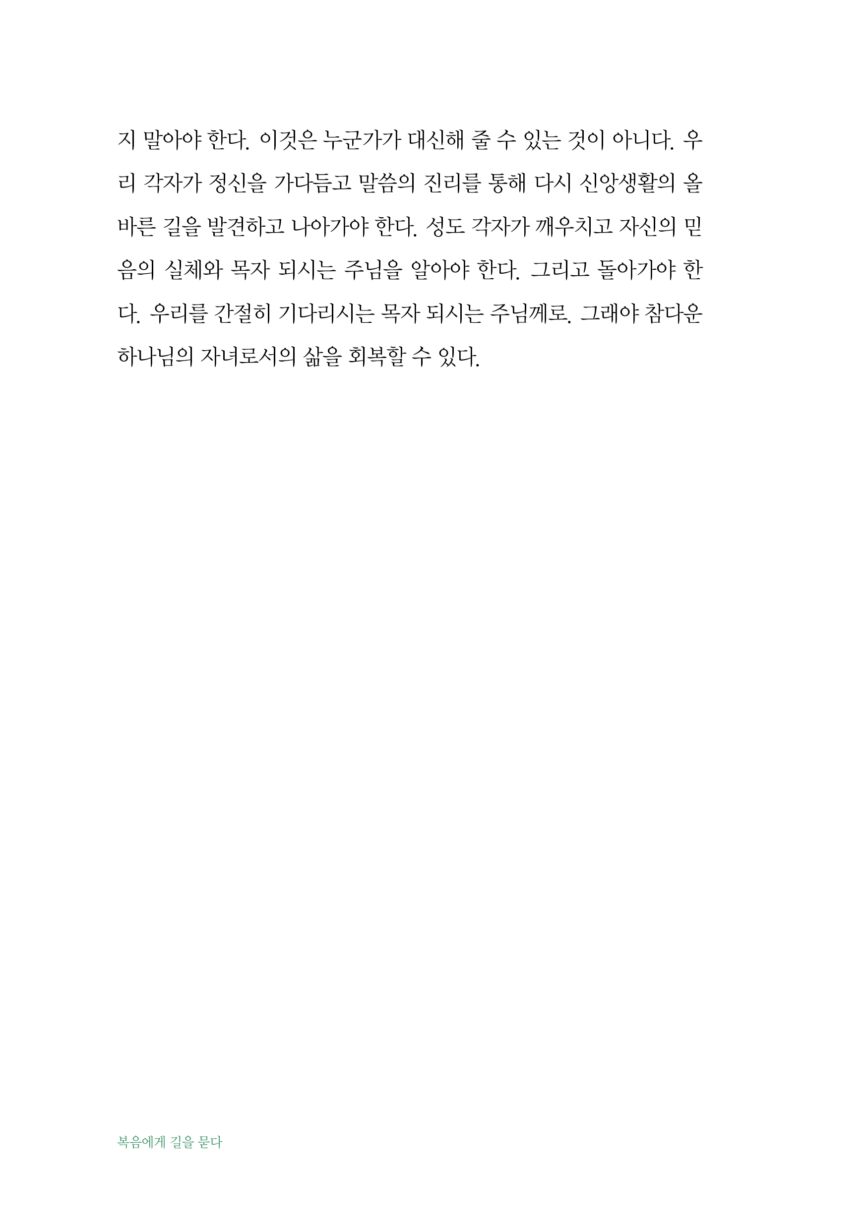 신앙생활의 시작이 복음이라면 마침도 복음이고 그 과정도 복음이다. 그런데 너무나 많은 사람들이 복음으로 시작한 신앙의 길에서 벗어나 다른 길을 가고 있다. 율법주의, 기복신앙, 인본주의 등 다양한 경로로 길을 잃고 있다. 이제는 돌아가야 한다. 복음의 주인공 되시는 주님께로 돌아갈 때 우리는 모든 불안과 불확실에서 벗어날 수 있을 것이다.