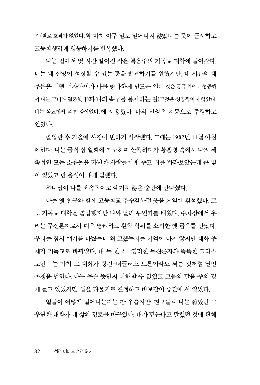 내 앞에 문 세 개가 있었다. 첫 번째 문: 그날 샌더스 극장에서 들었던 것을 무시하고 방금 내게 일어났던 일이 일어나지 않은 체하며 영적·지적 자동 조종장치로 내 삶의 길을 가면서 이 모든 볼을 그럭저럭 물 아래 가라앉게 한다. 두 번째 문: 나는 내가 속한 전통이 내게 기대했던 문을 취할 수 있었는데 그것은 바로 내가 방금 들었던 것에 반격하는 것이었다. 그것은 “성경의 방어자”가 되어 무슨 대가를 치르더라도 우리의 기대에 부응하는 성경을 필요로 하는 신앙의 요구를 보호하기 위해 물결을 거슬러 헤엄치는 것이었다. 나는 외양에도 불구하고 바울이 휴대용 우물이 된 바위에 관해 그런 어리석은 아이디어를 신봉했을 리가 없다는 것을 “증명”하는 데 내 삶을 헌신할 수도 있었다. 세 번째 문: 나는 방금 본 것을 직면하고, 도전을 받아들이며, 성경에 관해 다르게 생각하기 시작할 수 있었다. 나는 성경에 자신의 질문을 부과할 것이 아니라 고대의 문제들을 묻는 것을 배우고, 나 자신이 아니라 하나님을 신뢰하고, 자신이 어디에 있는지 아는 사람을 인도할 긴 여행에 착수할 수도 있었다.