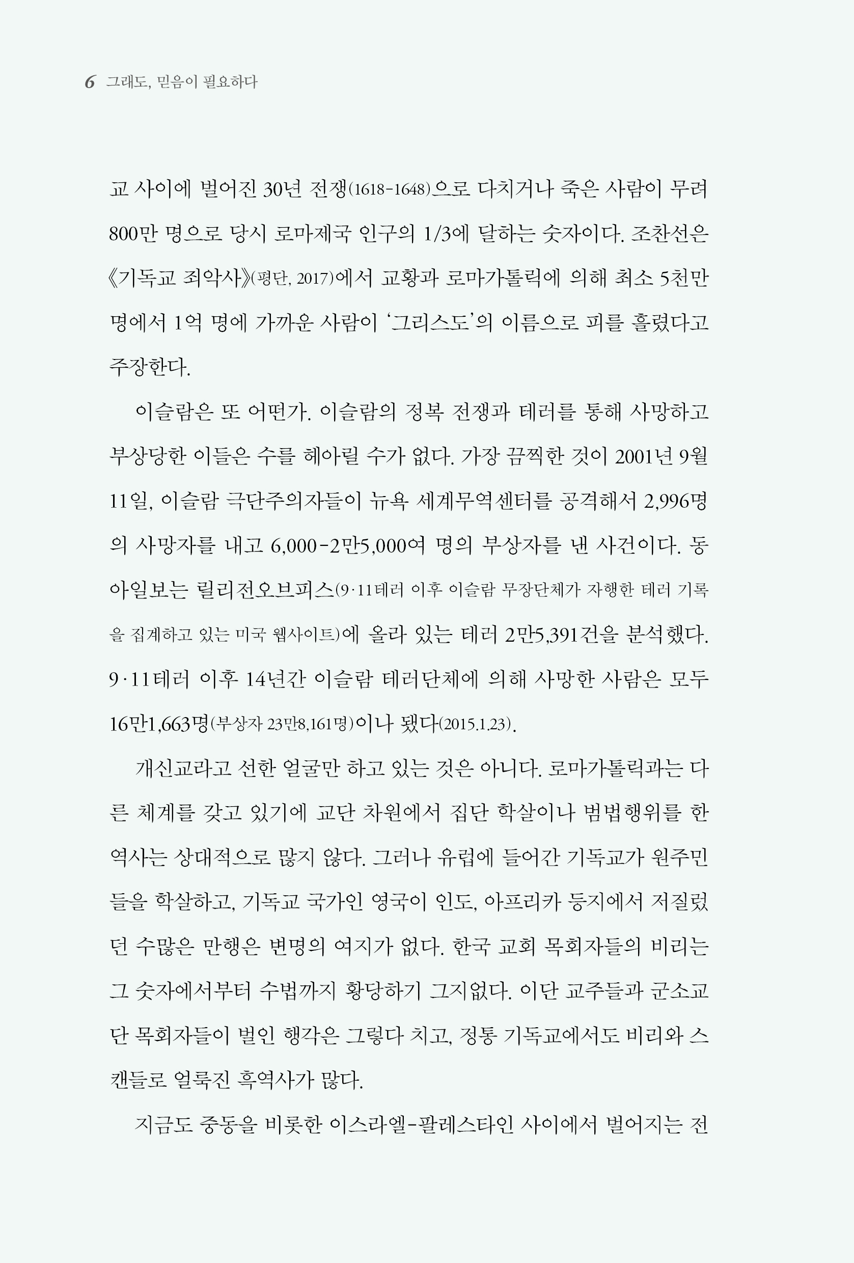 지금 세상은 무신론, 종교 해악론, 종교 말살론이 기세를 떨치고 있다. 무신론자들은 “인류가 신의 섭리에 따라 서로를 짓밟고 살아왔기에 지금부터는 인간다운 판단과 실천으로 신을 떨쳐버리고 새로운 미래를 꿈꿔야 한다”고 주장하며, 신이라는 존재 없이도 인간은 충분히 행복할 수 있다고 말한다. 종교는 일종의 폭력행위이며, 나쁜 역할도 많이 했고, 인류 역사에 지은 죄가 헤아릴 수 없이 많다는 것이다. 그러면서 무신론자들이 서로 연대하여 종교를 공격하는 집단행동에 나서야 한다고 극단적으로 말하기도 한다. 특히 대한민국에서 기독교는 비판받고 폄훼되고 사방으로 공격을 당하는 중이다. 비이성적이고 독선적이며 시대에 뒤떨어진 구시대 종교 유물이라 조롱한다. 이런 주장들이 대세를 이루면서 청소년, 청년들, 비판적인 시각을 가진 이들이 탈 기독교를 외치며 교회를 떠나고 있다. 그런데 이들의 주장처럼 인간은 종교 없이도 살 수 있을까? 정말 종교 없이도 행복할까?