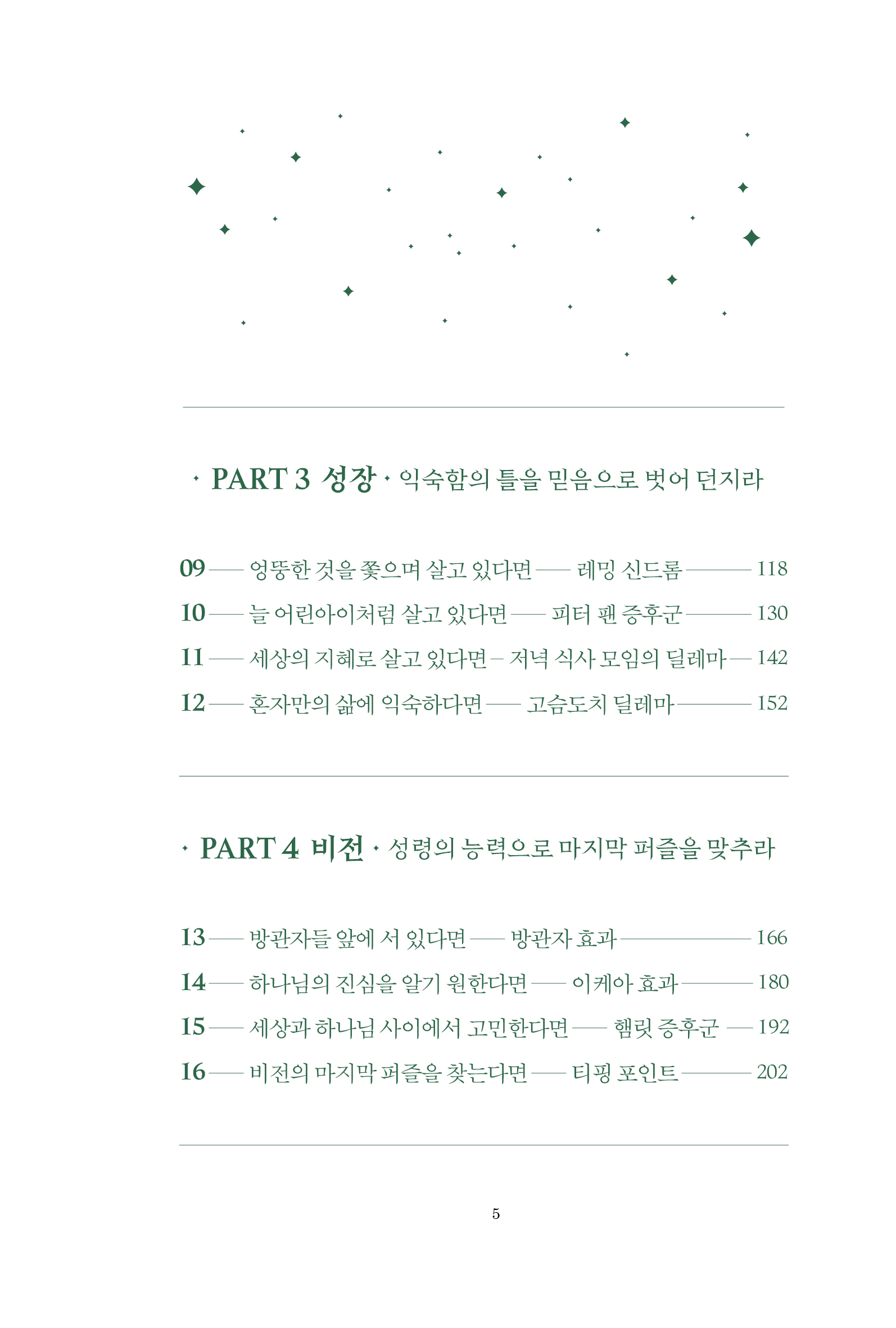 이 책은 마음, 믿음, 성장, 비전이라는 네 가지 큰 주제 아래 16가지 다양한 이론, 효과, 증후군 등을 다룬다. 1부 ‘깨진 마음의 파편들을 주께로 가져가라’에서는 현대인들이 자주 겪는 마음의 문제를 다룬다. 2부 ‘섣불리 결론짓지 말고 절대 긍정하라’에서는 믿음에 관한 이야기를 풀어낸다. 3부에서는 ‘익숙함의 틀을 믿음으로 벗어 던지라’며, 개인의 성장을 위한 도전을 던지고, 마지막 4부에서는 ‘성령의 능력으로 마지막 퍼즐을 맞추라’는 메시지를 통해 하나님의 비전을 완성하는 과정을 이야기한다.