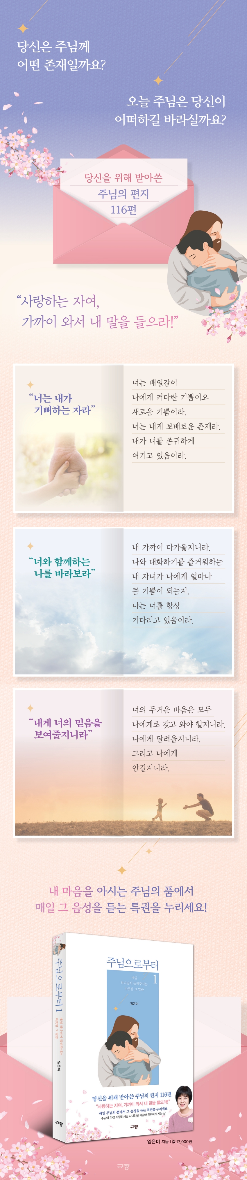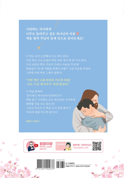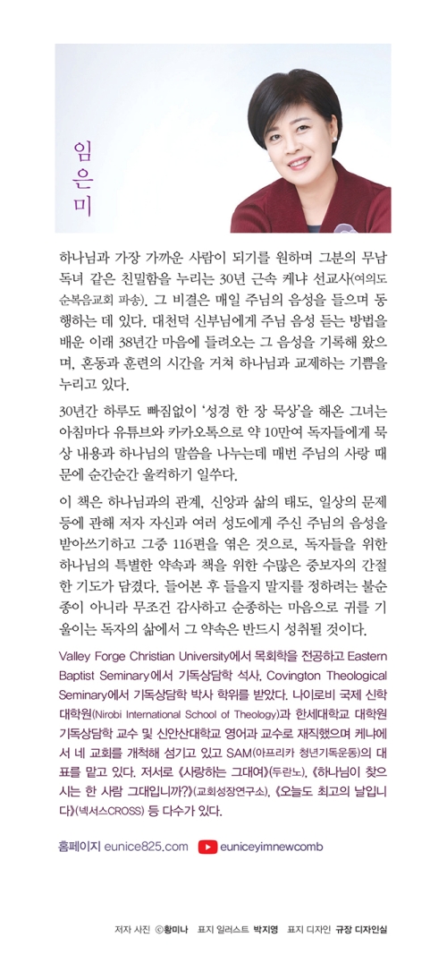 케냐에서 30년간 사역하고 있는 임은미 선교사는 38여 년간 매일 성경을 묵상하고, 주님이 주신 마음을 30년간 기록하며 음성 듣기 훈련을 해왔다. 그녀는 큰누이가 부모님의 말씀을 어린 동생에게 쉽게 풀어 전달해주듯, 주님이 매일 들려주시지만 잘 듣지 못하는 그분의 음성을 받아쓰고 아침마다 유튜브를 통해 전해주고 있는데, 이 책은 그 가운데 116편을 하나님의 자녀 된 우리의 정체성, 하나님의 동행하심, 하나님이 우리에게 기대하시는 장성한 분량의 모습이라는 세 주제에 따라 엮은 것이다. 프롤로그에는 독자들을 위한 주님의 특별한 약속과 음성 듣기의 방법이 담겼으며, 성경에 이미 기록된 주님의 말씀 및 여러 편지에 함께한 아름다운 이미지와 일러스트는 주님의 편지글을 더욱 따뜻이 느끼며 마음에 새길 수 있게 해줄 것이다. 나를 향한 주님의 말씀을 듣고 싶은 분, 외롭고 막막해 지친 분에게 꼭 읽어볼 것을 권하며, 위로와 격려가 필요한 분을 위한 선물로도 추천한다.