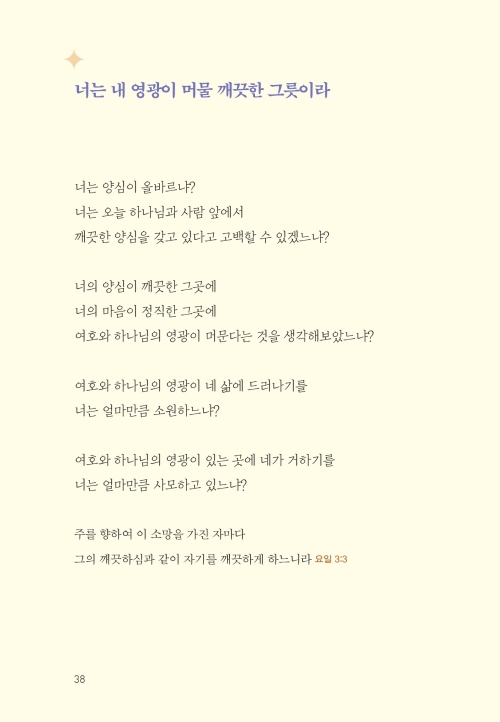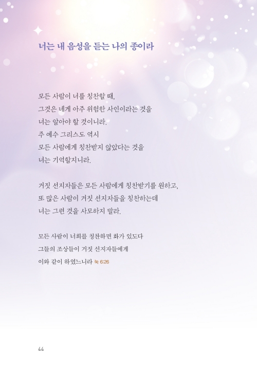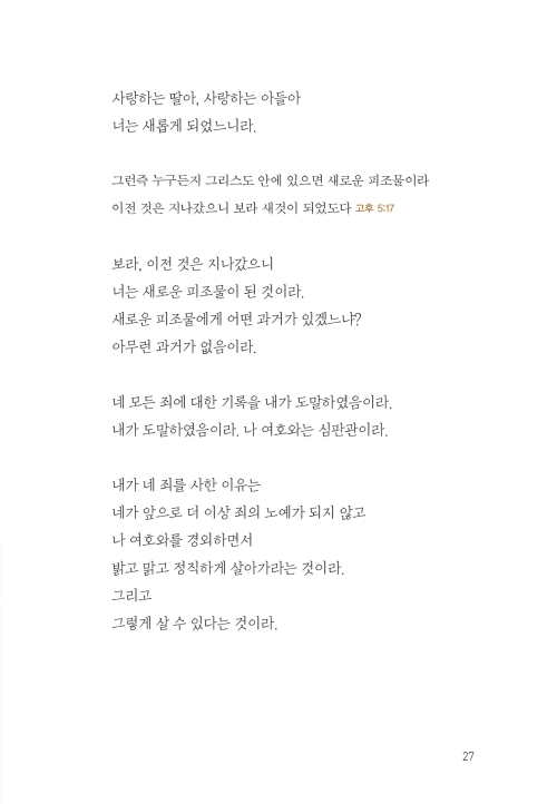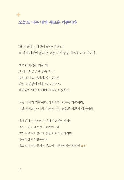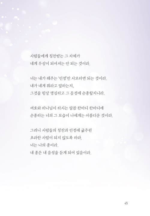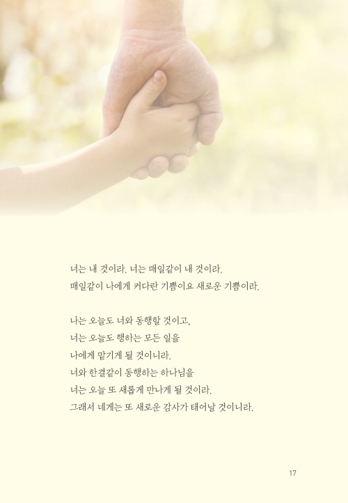 오늘도 너는 내게 새로운 기쁨이라|너는 나의 보배라|내 자녀가 된 특권을 누려라|너는 하나님의 사랑을 나타내는 빛 된 자라|너는 믿음의 경주자라|너는 새로운 피조물이라|너는 새롭게 살아갈 수 있단다|너는 나의 귀한 아들이라|네 죄를 감추지 말고 내게 고백하여라|용서받은 너는 사랑하는 자가 될지니라|내 사랑의 깊이를 헤아려보아라|너는 내 영광이 머물 깨끗한 그릇이라|성결하기를 힘쓰라|너는 내가 기뻐하는 종이라 |너는 내 음성을 듣는 나의 종이라|하나님을 종 부리듯 기도하지 말라|하나님께 영광을 돌린다는 말의 의미|앞서가지 말고 분명한 내 뜻을 먼저 행할지니라|힘을 얻고 더 많이 얻게 되는 비결|일어나 내게로 돌아오너라|너는 온전한 성전으로 지어져 가고 있느니라|고난의 때는 네가 성숙되는 시간이라|정직하고 나를 기다리는 너를 기뻐하노라|네 생각이 나로 가득하기를 바라노라|사랑할 수 없다면 감사부터 해 보아라|내 사랑이 너를 세우고 힘을 주리라|나의 계획이 있는데 왜 남과 비교하느냐|오늘도 네게 구원의 기쁨과 감사가 있느냐?|사랑을 포기하지 않되 나를 먼저 사랑하라|네가 가진 것들이 아니라 하나님을 기뻐하라|나의 일을 할 때 기뻐하고 감사하라|내가 너를 잊어 응답이 없다고 생각하느냐?|나를 사랑하는 마음이 없다면|하나님의 뜻을 분별하기 원한다면|내가 부어주는 성령의 역사가 무엇인지 아느냐?|환난 날에 반드시 명심하라|오늘 너의 기도 제목이 이것이면 좋겠구나|나 외에 의지할 곳 없음이 자랑이길 바라노라|네 기쁨은 세상 사람들의 기쁨과 달라야 한단다
