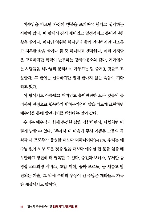 우리가 저지른 죄는 단순히 윤리적인 문제가 아니다. 이는 하나님께 대한 신실함의 문제일 뿐 아니라, 우리의 가장 크고 심오한 만족을 찾는 문제이기도 하다. 그러나 어떤 죄를 지었든 우리의 유일한 소망은 그리스도를 향하는 것이다. 존 파이퍼와 desiringGod 필진이 함께 쓴 이 책은 단순히 나쁜 습관을 교정하는 것이 아니라, 죄에 대한 복음적인 해답을 제시하며 그리스도와의 보다 깊은 결혼생활로 우리를 이끌 것이다.