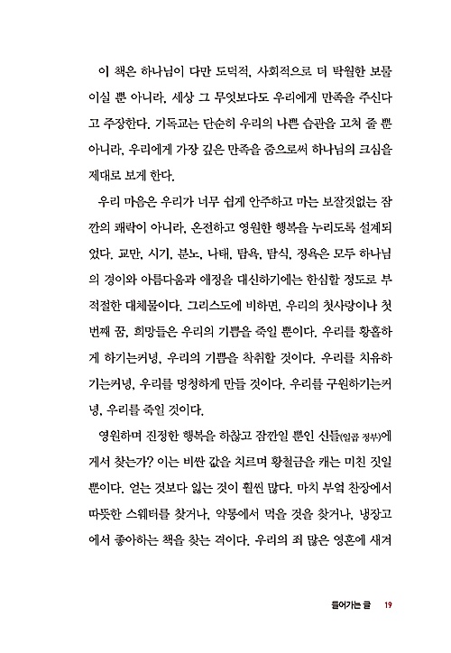 “최고의 만족을 누리라. 그리스도 안에서 즐거움을 누리는 법을 배우라. 많은 사람이 정욕의 지배에서 벗어나지 못하는 이유 한 가지는 그리스도께 큰 매력을 느끼지 못하기 때문이다. 그리스도 안에서 누리는 즐거움이 없다시피 하기에 거짓에 속아 넘어간다. “그런 즐거움은 나와 안 맞아요”라고 말하지 말라. 예수님에 대한 애정을 일깨우기 위해 몇 단계나 밟아 보았는가? 그 기쁨을 얻으려고 정말로 싸워 보았는가? 태생이 그렇게 안 된다고 말하지 말라. 당신은 전심으로 그리스도를 즐거워하도록 창조되었다. 우리는 성이나 설탕, 스포츠나 쇼핑보다 그분을 더 기뻐할 수 있다. 예수님을 별로 기뻐하지 않는다면, 다른 쾌락이 이길 것이다. 당신이 소유하지 못한 만족을 하나님께 구하라. “아침에 주의 인자하심이 우리를 만족하게 하사 우리를 일생 동안 즐겁고 기쁘게 하소서”(시 90:14). 그런 다음, 온 우주에서 가장 놀라우신 그분을 보고 또 바라보라. 가장 아름다우시고 우리에게 큰 만족을 주시는 그분의 진짜 모습을 볼 수 있을 때까지 계속해서 바라보라.” _8장 정욕