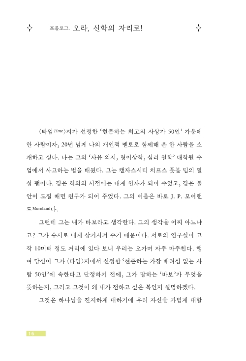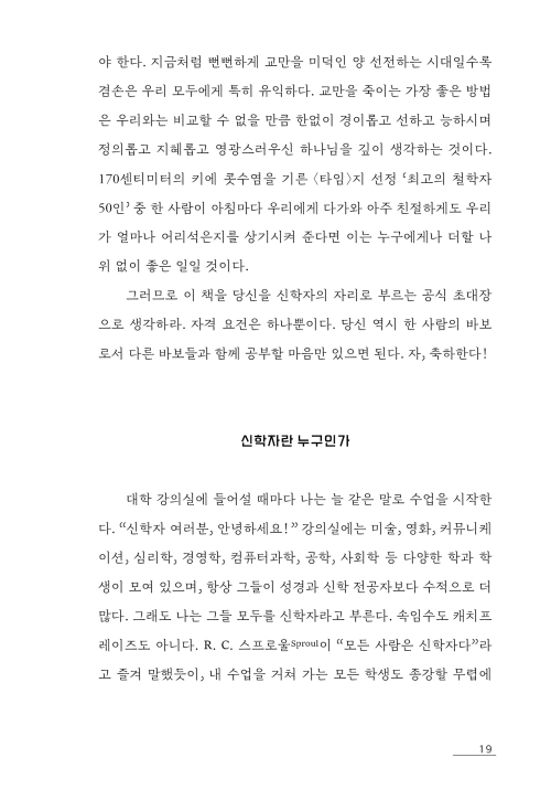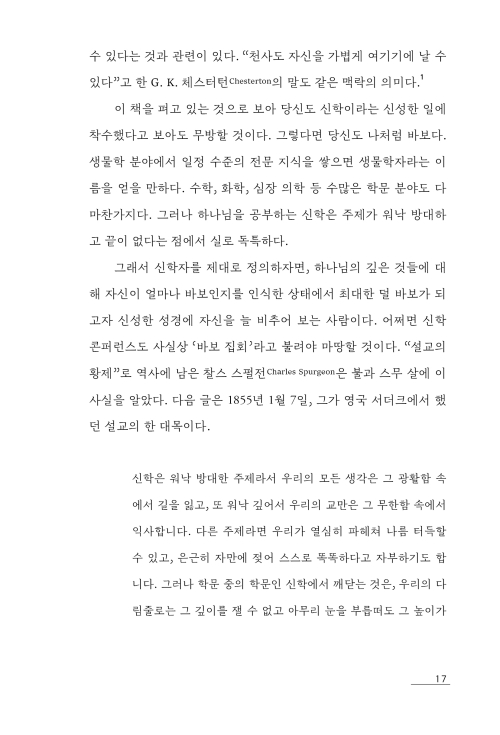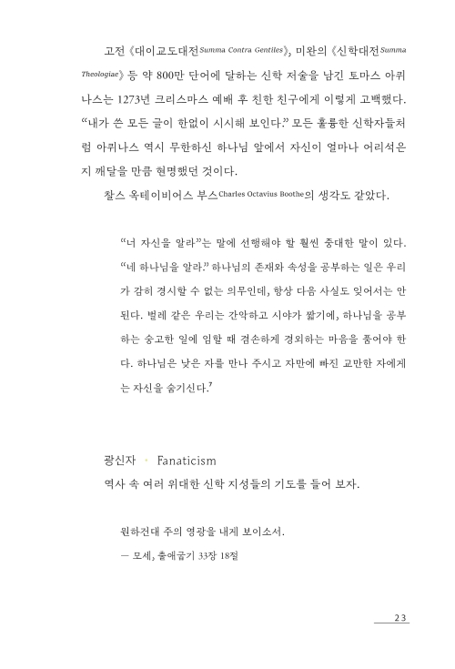 결국 신학자란 누구인가? 신학자는 바보요, 광신자이며, 괴짜이고, 투사인 동시에 노예다. 우리가 자아와 자신의 입지를 섬긴다면, 하나님의 은혜가 매 순간 필요함을 잊는다면, 고질적 죄를 묵과한다면, 성경책에 먼지가 앉게 둔다면, 하나님을 알고 즐거워하는 게 아니라 그분에 대한 지식에 안주한다면, 교만하게 아는 체한다면, 우리는 신학이라는 신성한 일에서 실패하는 것이다. 어쩌면 이 모두를 ‘경외’라는 한 단어로 압축할 수 있을 것이다. 신학자는 하나님을 경외하는 사람이다. 지성(知性)으로 하나님을 사랑하기보다 자신의 지성을 더 사랑하는 사람에게 과연 경외심이 얼마나 있을까? 하나님의 감동으로 기록된 말씀을 깨작거리기만 하는 사람, 자신의 죄를 죽이지 않고 내버려두는 사람, 자신을 창조하신 분의 명예보다 자기 명예를 더 중시하는 사람이 하나님을 얼마나 경외할까? 틀림없이 경외와는 거리가 먼 사람일 것이다. 그런 사람은 성경에 300번도 넘게 등장하는, 가장 많이 반복되는 명령 가운데 하나를 어기는 것이다. 바로 여호와를 “이르아”하라, 즉 주님 앞에서 두려워하고 경외하고 경탄하라는 명령이다. 경외하는 마음으로 창조주를 탐구하는 일만큼 우리의 교만을 꺾고 깊은 기쁨과 생명을 가져다주는 값진 일도 없다. 지금부터 우리는 진리를 말씀하시고, 우리를 만족시키시고, 통치하시며, 사랑하시고, 죄인을 구원하시고, 아름다움을 창조하시는 하나님께 경탄을 표하려 한다.
