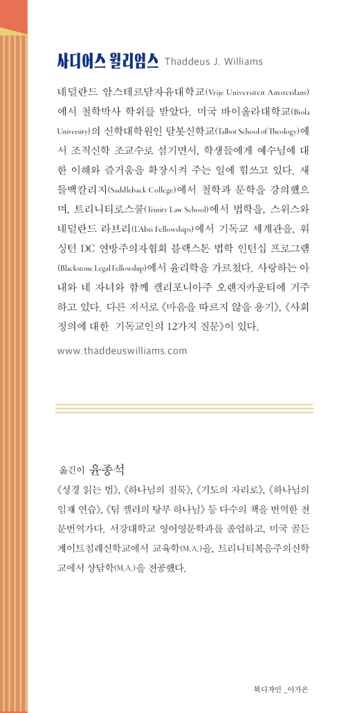 사디어스 윌리엄스는 우리가 하나님을 아는 데서 그치지 않고 그분을 사랑하기를 바란다. 그 목표를 위해 그는 이 책에서 신학과 변증, 그리고 여러 성숙한 그리스도인들의 증언을 감동적이면서도 매우 실제적으로 조화롭게 엮어 냈다. 하나님의 무한하신 깊이와 사랑과 지혜와 은혜와 창조력과 위엄을 다각도로 제시한 이 책을 읽고 나니 절로 그분을 향한 예배가 우러나왔다. 예배받기에 합당하신 하나님과 그분 중심의 세계관을 아직 접해 보지 못한 많은 이들이 이 책을 읽고 영원히 변화되기를 바란다.