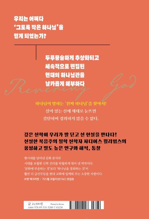 인간이 존재하는 가장 큰 이유는 하나님을 영화롭게 하고 그분을 즐거워하는 것이다. 그런데 오늘날 많은 이들에게 기독교의 하나님은 그저 ‘복을 베푸는 모호한 선의의 존재’거나 ‘하늘에 투사된 내 자아의 확대판’, ‘비위 맞추기 힘든 심사위원’에 불과하다. 도대체 우리가 믿는 하나님은 누구인가? 더는 하나님을 궁금해하지도 애써 알아보려 하지도 않는 세대, 경외함을 잃어버린 오늘날의 그리스도인들에게 강력한 초대장이 날아왔다.