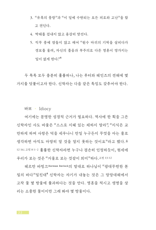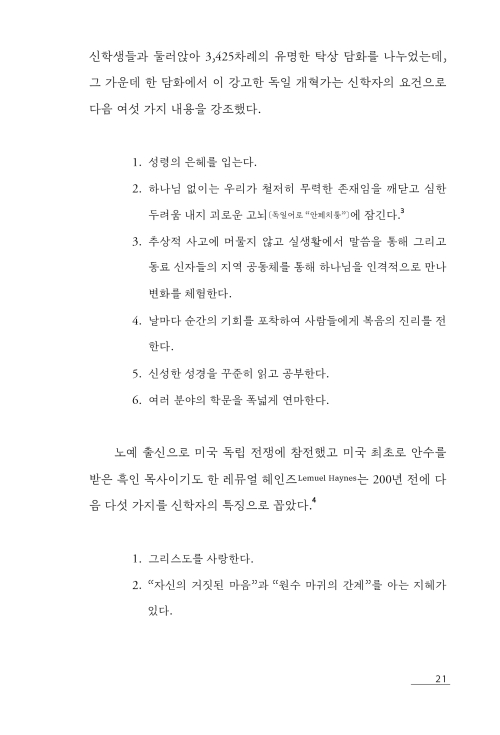 신학자는 투쟁하는 사람, 곧 투사(鬪士)여야 한다는 내 말은 타인을 해치는 물리적 폭력이나 다른 형태의 폭력을 뜻하지 않는다. 그보다 바울이 “성령으로 몸의 행실을 죽이라”(롬 8:13, ESV), “땅에 있는 지체를 죽이라”(골 3:5), “그리스도 예수의 사람들은 육체와 함께 그 정욕과 탐심을 십자가에 못 박았느니라”(갈 5:24)라고 말한 그 의미다. 훌륭한 신학자는 완벽하지는 않지만, 청교도의 표현처럼 실제로 “죄를 죽인다.” 자신의 마음을 위협하는 모든 고질적 죄를 성령의 능력으로 힘써 죽인다. 머리와 가슴을 가장 빠르게 갈라놓는 길, 올바른 교리가 무력해지는 가장 확실한 길, 영적 불모지와 허무주의의 황무지로 가는 지름길은 일상생활 속에서 자신의 죄를 죽이지 않고 내버려두는 것이다. 이에 대해 영국 청교도 존 오웬이 좀 더 잘 말했다. “신앙생활의 생명과 활력과 위안은 상당 부분 우리의 죄를 죽이는 데 달려 있다. ····· 죄를 죽이지 않으면 하나님의 사랑과 은총이 죄에 막혀 비쳐 들지 못한다. 그분의 자녀로 입양된 것이 특권으로 느껴지지 않는다. ····· 죄를 죽이라. 그렇지 않으면 죄가 당신을 죽일 것이다.”