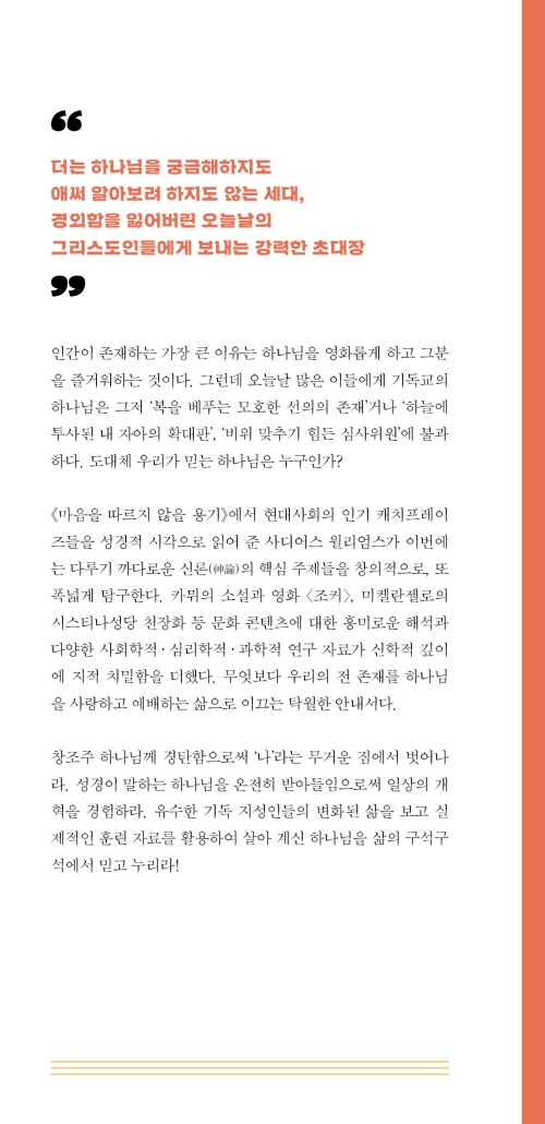 《마음을 따르지 않을 용기》에서 현대사회의 인기 캐치프레이즈들을 성경적 시각으로 읽어 준 사디어스 윌리엄스가 이번에는 다루기 까다로운 신론(神論)의 핵심 주제들을 창의적으로, 또 폭넓게 탐구한다. 카뮈의 소설과 영화 〈조커〉, 미켈란젤로의 시스티나성당 천장화 등 문화 콘텐츠에 대한 흥미로운 해석과 다양한 사회학적 · 심리학적 · 과학적 연구 자료가 신학적 깊이에 지적 치밀함을 더했다. 무엇보다 우리의 전 존재를 하나님을 사랑하고 예배하는 삶으로 이끄는 탁월한 안내서다.
