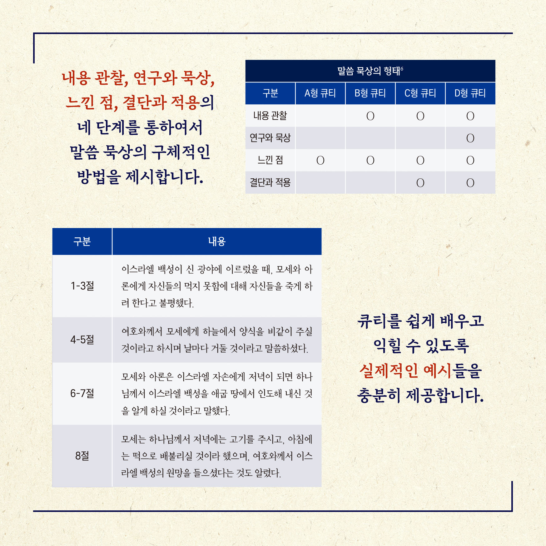말씀 묵상은 하나님과 상관없이 살던 자를 하나님과 상관있게 만드는 시간이다. 이는 말씀이신 그리스도를 알아가기 위해 힘쓰는 시간이기도 하다. 말씀 묵상의 형태가 ‘관찰-해석-적용’이 되느냐, ‘내용 관찰 - 연구와 묵상 - 느낀 점 - 결단과 적용’이 되느냐가 중요한 것은 아니다. A형 큐티, B형 큐티, C형 큐티, D형 큐티의 형태 나눔이 중요한 것도 아니다. 중요한 것은 내가 말씀을 먹고 이해하고, 반응하고 적용하기 위해 구조적으로 접근할 수 있는 능력을 향상할 때, 온전한 사람으로 자라나게 된다는 것이다.