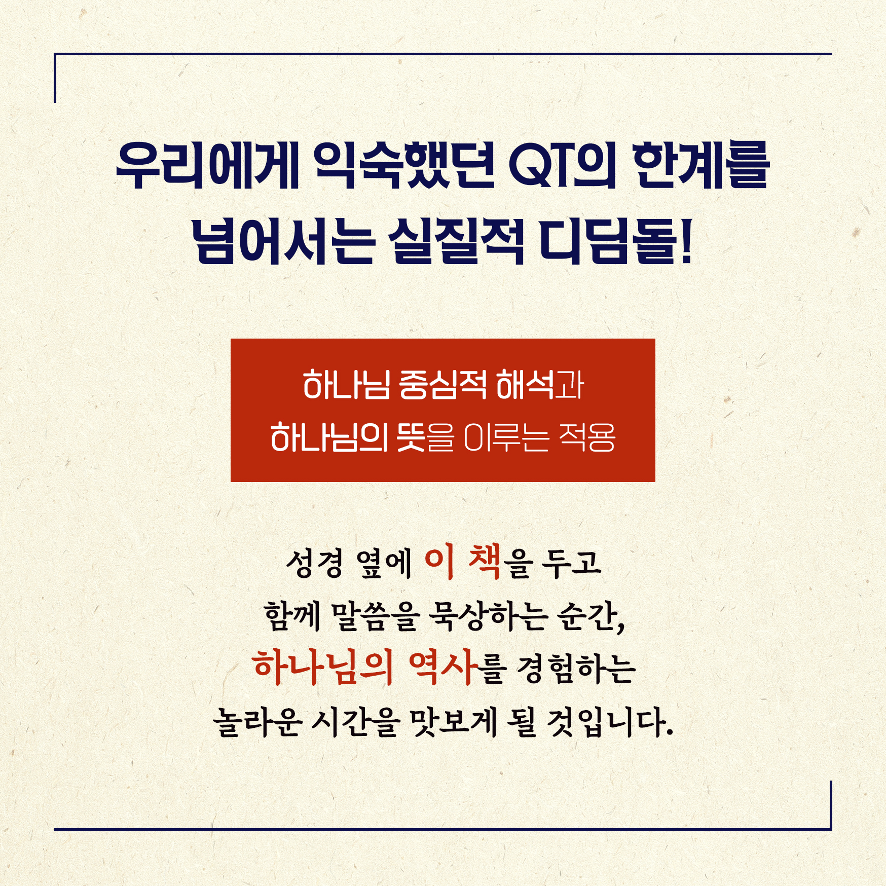 이 책은 우리에게 익숙했던 QT의 한계를 뛰어넘는 실질적인 디딤돌이 될 것입니다. 자기중심적 해석에서 벗어나 하나님 중심적 해석을 가능케 하고, 하나님의 뜻을 이 땅에서 이루는 적용이 가능하도록 여러분을 도울 것입니다.