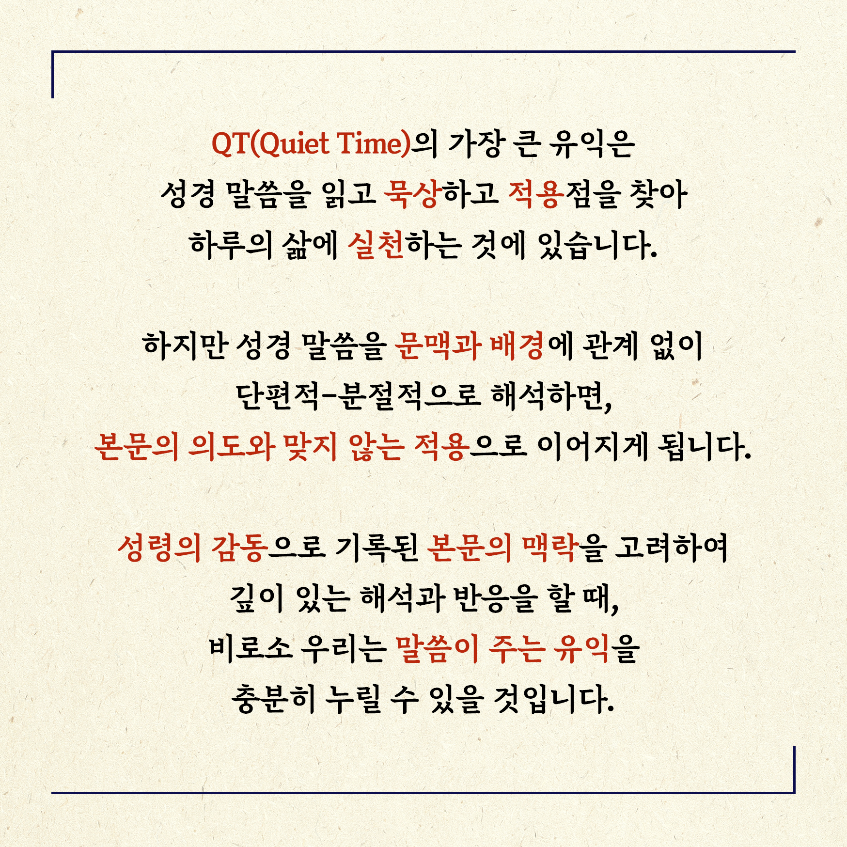 QT(Quiet Time)의 가장 큰 유익은 짧은 시간에 성경 말씀을 읽고 묵상하고 적용점을 찾아 하루의 삶에 실천하는 데 있습니다.