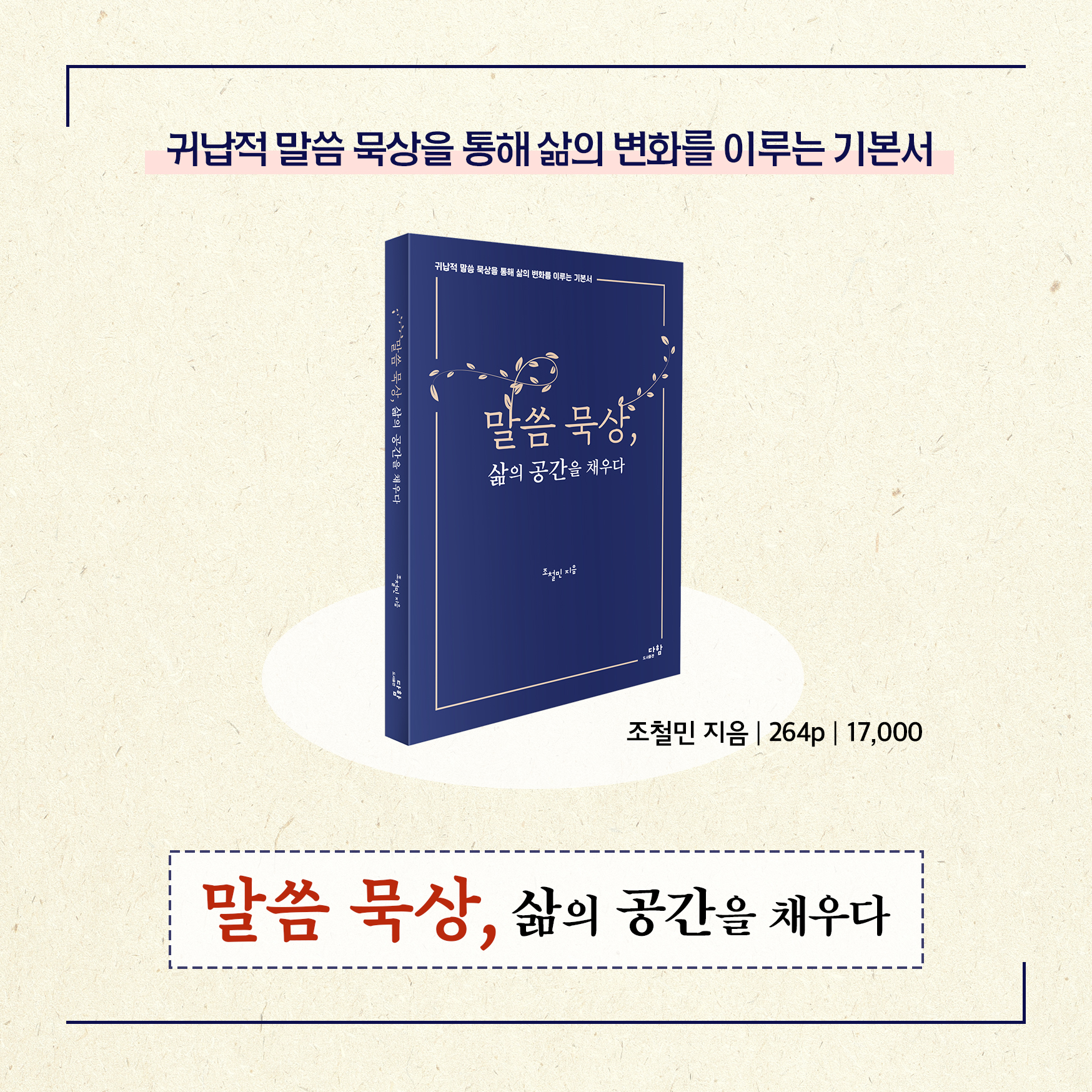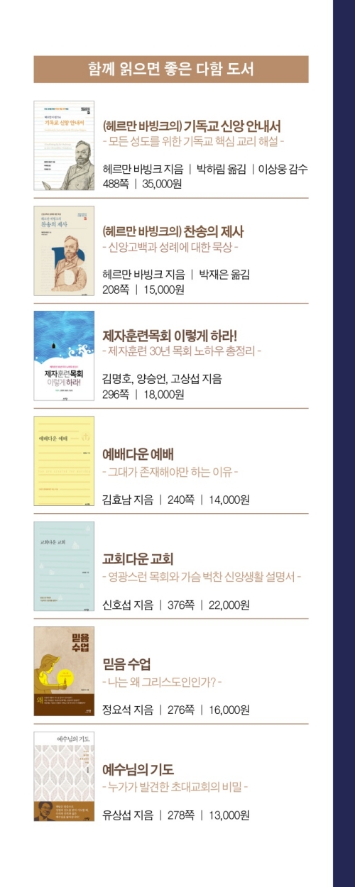 그동안 한국교회는 말씀을 사모하는 성도들은 많은 데 비해 제대로 된 말씀 묵상 가이드북이 없었습니다. 이번에 조철민 목사님의 신간 『말씀 묵상, 삶의 공간을 채우다』가 다함출판사에서 출간된다는 이야기를 듣고 ‘정말 이 책을 쓸 적임자가 드디어 책을 내는구나’라는 생각이 들었습니다. 조철민 목사님의 사역은 늘 말씀과 함께, 말씀의 곁에, 그리고 말씀의 중심에 있었습니다. 특히 국제제자훈련원에서 출간하는 《날마다 솟는 샘물》의 책임자로 오랜 시간을 섬겼고, 평신도를 깨운다 제자훈련 지도자 세미나(CAL 세미나)에서도 말씀 묵상 강의자로 이 분야에서 가장 특화된 저자입니다. 사실 제자훈련에서 경건의 생활을 다룰 때 QT(Quiet Time), 즉 말씀 묵상은 제자훈련의 첫 번째 관문이라고 할 수 있습니다. 그래서 모든 인도자가 가장 심혈을 기울여 이 과정에서 훈련생들과 몸부림을 칩니다. 하지만 생각보다 이 과정을 매끄럽게 진행하는 것이 쉽지 않습니다. 그런 면에서 이 책은 말씀 묵상을 사모하는 사람들에게는 더할 수 없는 지침서가 될 것입니다. 또한 제자훈련의 말씀 묵상 훈련을 위한 교재로 금상첨화(錦上添花)라 할 수 있습니다. 이 책은 말씀 묵상의 원칙에서 실제까지 독자들을 말씀의 세계로 인도하고 있습니다. 특히 부록에서는 말씀 묵상을 위한 실습까지 담고 있습니다. 특히 조철민 목사님이 에필로그에 말씀 앞에서 심장이 뛴다고 고백했는데, 이 책을 펼친 모든 독자의 가슴이 말씀의 엔진으로 다시 뛰게 될 것이라 소망하며, 즐겁게 일독을 권합니다.