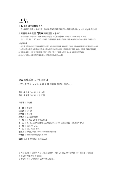 불안과 불확실성이 가득한 오늘날을 살아가는 그리스도인에게, 말씀 묵상은 하나의 신앙 훈련이 아닌 존재와 삶의 기준을 바로 세우는 은혜의 시간입니다. 또한 온갖 거짓 소식과 인간의 욕망으로 유혹하는 세상에서, 우리가 걷는 인생길이 생명과 진리의 길이 되도록 하는 일은 말씀 묵상에서 시작됩니다. 조철민 목사님의 『말씀 묵상, 삶의 공간을 채우다』는 바로 이 길을 올곧게 가고자 하는 성도에게 전하는 따뜻하고 친절한 말씀 묵상 가이드입니다. 저자는 국제제자훈련원에서 큐티 잡지 디렉터로 오랫동안 사역하면서, 성도의 말씀 생활을 가까이에서 도와온 경험을 이 책 곳곳에 담았습니다. 그래서 책장을 넘길 때마다 말씀 앞에 섰던 저자의 경험과, 한 영혼이라도 말씀 앞에서 하나님을 제대로 만나도록 돕고자 하는 목자의 진심이 느껴집니다. 앞서 말한 대로 이 책은 따뜻하고 친절한 책입니다. 우선 이 책은 말씀 묵상을 어렵게 느끼는 성도에게 이는 ‘난이도의 문제가 아니라 익숙함의 문제’라는 위로를 건넵니다. 그리고 구체적인 ‘D형 큐티 방법론’을 통해 말씀 묵상의 길을 차근히 안내합니다. 본문을 관찰하고, 질문하며, 느끼고, 결단하는 여정은 단순한 지식 습득이 아니라 하나님과의 인격적 만남을 통한 변화로 이끕니다. 무엇보다 이 책의 가장 큰 매력은 묵상을 생활로 자연스럽고 친절하게 잇는다는 점입니다. 그래서 말씀을 머리로 ‘공부’하는 데서 멈추지 않고, 나의 하루를 바꾸는 힘이 되도록 만듭니다. 특히 마지막 단계인 ‘결단과 적용’에서 제시하는 구체적인 원리는 말씀 묵상이 삶의 변화를 일으키는 믿음의 행위임을 깨닫게 합니다. 『말씀 묵상, 삶의 공간을 채우다』는 말씀으로 일상을 채우고 싶은 모든 신앙인에게 꼭 권하고 싶은 책입니다. 이 책에는 메마른 이론이 아닌 삶으로 증명된 경건함과 교훈이 아닌 동행의 따뜻함이 담겨 있습니다. 이 책이 보이는 묵상의 길을 따라 새롭게 걸어가 보십시오. 말씀 속에서 그리스도를 더 깊이 알아가고, 세상 속에서도 흔들리지 않는 영적 분별력과 평안을 얻게 될 것입니다. 그리고 어느새 하나님의 인도하심 속에서 하루하루를 새롭게 살아내는 자신을 발견하게 될 것입니다.