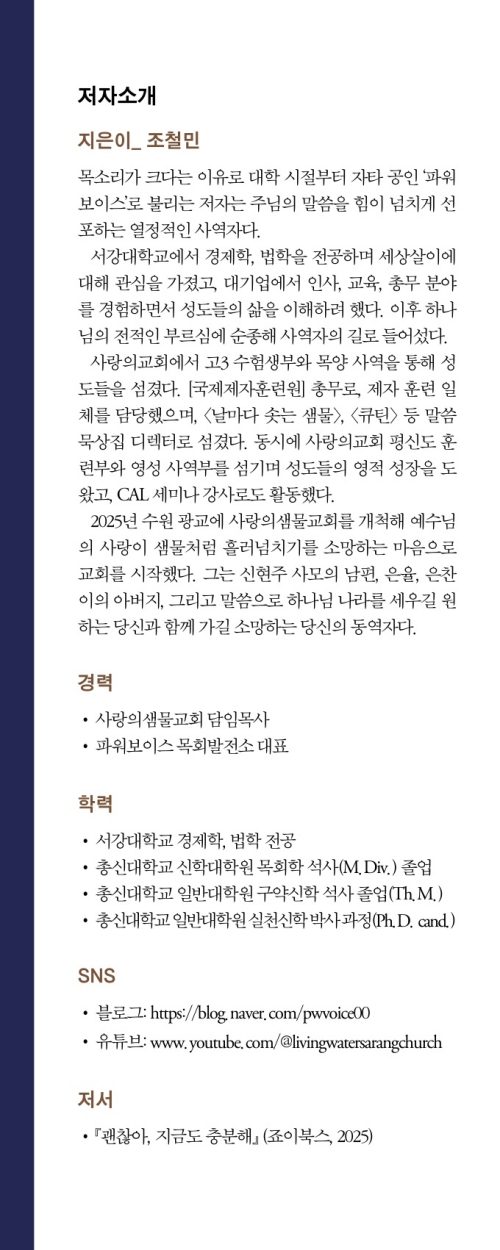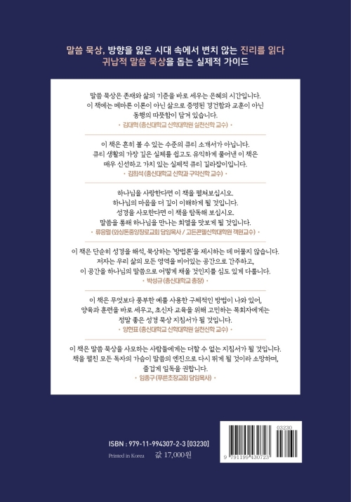나는 제자이자 이 책의 저자 조철민 목사님에게 감동합니다. 특히 조철민 목사님의 끊임없는 열정과 도전 정신에 감동합니다. 조 목사님이 말씀 묵상과 관련한 책을 썼다고 했을 때 많은 기대를 했는데, 의심할 여지없이 말씀 묵상 영역에서 오랫동안 쌓아온 그의 전문성을 그대로 볼 수 있었습니다. 조 목사님은 학사 에스라의 고백(에스라 7:10)을 말씀 묵상을 시작하기 위한 첫 출발점으로 삼았다고 고백합니다. 결국 성도가 살아나고 세상을 살리는 길은 오로지 하나님의 말씀을 묵상하는 길이라고 확신했다고 저술하였는데, 매우 탁월하고 적절하고 공감이 가는 견해입니다. 이 책은 말씀의 가치, 말씀에 대한 태도, 말씀 묵상의 이유, 말씀 묵상의 방법, 그리고 말씀 묵상 결과의 적용과 실천 등에 관하여 매우 구체적이면서도 쉽게 설명하고 있습니다. 특히 말씀 묵상을 위해 제시한 ‘D형 큐티 방법론(내용 관찰, 연구와 묵상, 느낀 점, 결단과 적용)’에 대한 적절한 예를 통한 설명은 많은 목회자들에게 도움을 줄 것이라 확신합니다. 특히 개인적으로는 말씀 묵상을 ‘곰탕과 두발자전거’를 통해 유비(類比)한 부분에서 무릎을 쳤습니다. 말씀 묵상에 대한 꾸준함의 중요성과 몰입을 강조하는 매우 적절한 유비라고 생각했기 때문입니다. “결국 내 마음속에 성경을 묵상하면서 뜨거움이 올라왔다면, 성령의 역사가 자유롭게 일어나도록 적용의 단계로 나아가야 한다”라는 조 목사님의 외침은, 성경책을 들고 다니는 사람조차 희귀해진 오늘의 세상에서 성도들에게 큰 울림을 줍니다. 무엇보다 풍부한 예를 사용한 구체적인 방법이 나와 있어, 양육과 훈련을 바로 세우고, 초신자 교육을 위해 고민하는 목회자에게는 정말 좋은 성경 묵상 지침서가 될 것입니다. 다시 한번 이와 같은 성경 묵상 안내서를 세상에 내놓은 조철민 목사님의 노고를 진심으로 치하하며, 많은 분들이 읽고 적용하며, 더욱 강건한 영적 군사로 세워지길 기도합니다.