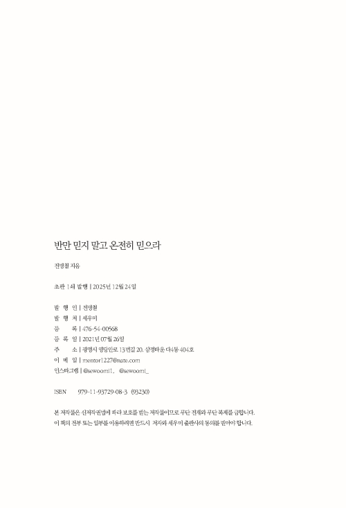 에필로그는 온전한 믿음이 가져오는 영적 결과를 조용히 제시한다. 온전한 믿음은 하나님을 기쁘시게 하며, 세상 사람들이 여호와 하나님과 예수 그리스도를 보게 하는 디딤돌이 된다. 저자는 작은 것부터 실천하는 순종이 결국 믿음을 세우는 토대가 되며, 단련된 믿음이야말로 장차 주님의 나라에서 누릴 영광의 소망을 이루는 길이라고 말한다. 반만 믿지 말고 온전히 믿으라는 지적·영적 차원 모두에서 깊은 울림을 남긴다. 목회자에게는 강단 메시지의 본질을 점검하게 하고, 성도에게는 일상의 신앙을 뿌리부터 다시 살피도록 이끄는 명확하고 힘 있는 안내서다. “잘하였도다. 착하고 충성된 종아”라는 칭찬이 어떤 길을 통해 가능해지는지를 묻는 이 책은, 믿음의 본질을 다시 중심에 놓게 만드는 명료하고 힘 있는 안내서이다.