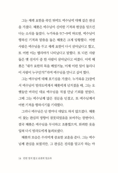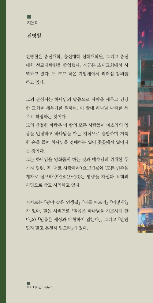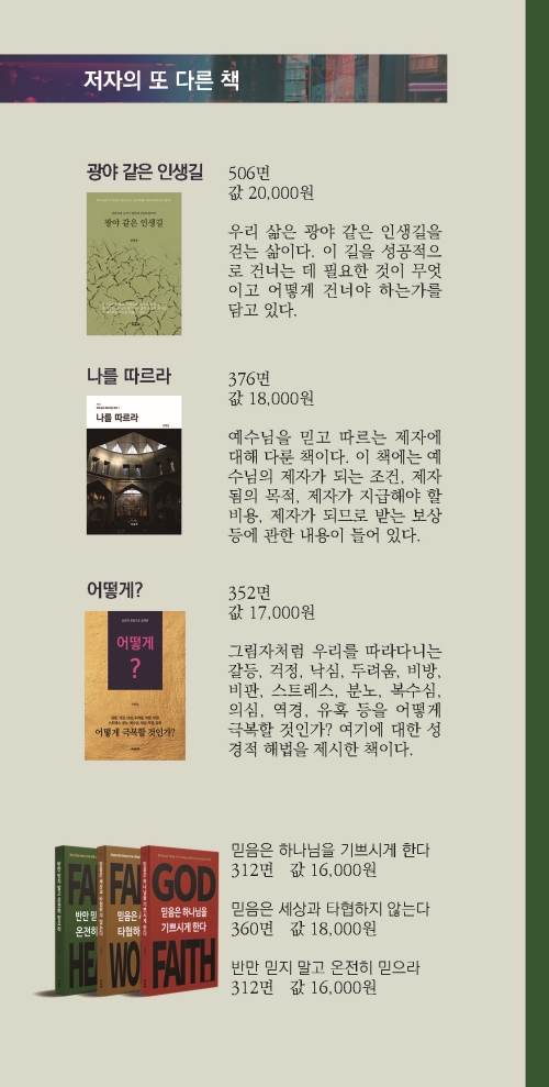 이 책은 믿음이 행함과 분리될 수 없는 삶의 태도임을 일관되게 강조한다. 시련 속에서 단련된 믿음만이 하나님을 기쁘시게 하며, 장차 주님과 함께 누리게 될 영광의 자리에 이르는 소망을 확고하게 한다. 반만 믿지 말고 온전히 믿으라는 신앙의 본질을 다시 중심에 놓게 하는 안내서다. 흔들리는 시대 속에서 믿음을 점검하고, 온전함을 향한 성숙의 길로 나아가고자 하는 독자에게 분명한 방향을 제시한다.
