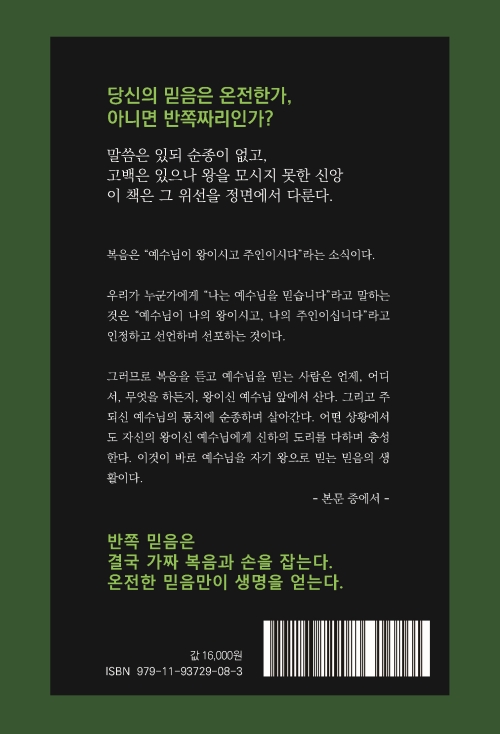 책이 제시하는 가장 도전적인 메시지는 예수 그리스도의 왕권, 곧 주권에 관한 문제다. 예수를 ‘구원자’로는 받아들이면서 ‘왕’으로는 인정하지 않는 불완전한 신앙을 날카롭게 비판한다. 저자는 우리의 삶을 지배하는 여러 ‘가짜 왕’들을 구체적으로 드러낸다. 정치적 권력, 재물, 국제적 강대국, 그리고 가장 은밀한 왕좌를 차지한 자아까지, 이 모든 것이 예수의 왕좌를 대신 점령한 상태를 폭로한다. 온전한 믿음은 예수 그리스도를 마음의 왕으로 모시고 전 인격을 다해 순종하는 삶이라는 선언은, 믿음이 단순한 고백이나 지식이 아니라 일상의 태도와 행위로 드러나야 한다는 점을 강조한다.