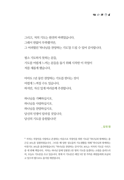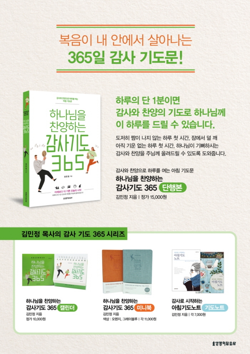 『하나님을 찬양하는 감사기도 365』는 김민정 목사의 기도문 시리즈 중 세 번째 책입니다.