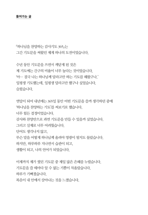 간구하는 기도는 쉽게 튀어나오는데, 하나님을 찬양하고 감사하는 기도는 너무 어렵게만 느껴지는 독자가 있다면 저자의 고백이 위로가 될 것입니다. 그간 다수의 기도 책을 지은 저자 또한 같은 고민을 했습니다. 날마다 구하는 기도만 하다가 하나님을 찬양하고 감사하는 기도를 하려니 처음엔 당황스러웠다고 합니다. 적절한 단어도 생각나지 않고, 무슨 말을 어떻게 하나님께 올려야 영광이 될지도 몰랐습니다. 하지만 하루하루 지나면서 감사와 찬양의 언어는 습관이 되고, 생활이 되고, 자신의 언어가 되었습니다. 그리고 그간 써온 기도문 중 『하나님을 찬양하는 감사기도 365』를 쓰면서 제일 많은 은혜를 누렸다고 합니다.
