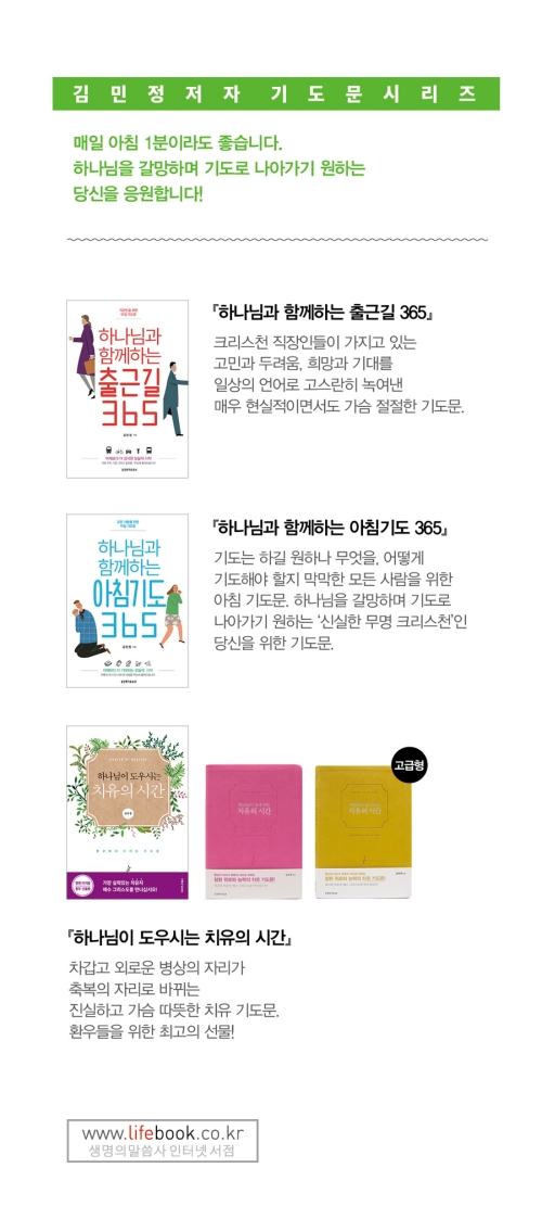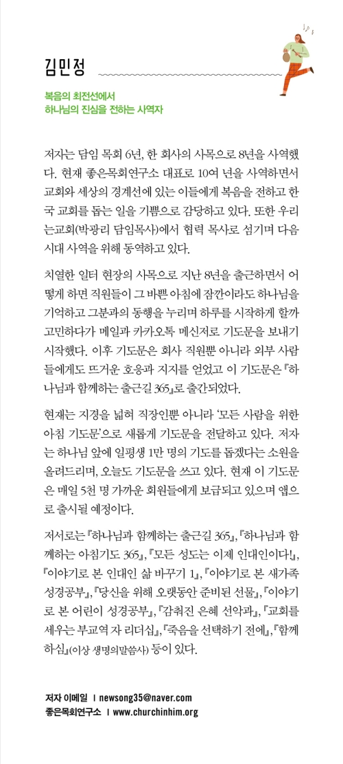 저자는 직장인을 사랑하고 존경하는 마음으로 『하나님과 함께하는 출근길 365』를 집필하였으며, 그 다음 해 일반 성도들의 기도생활을 위해 『하나님과 함께하는 아침기도 365』를 출간하였고 이 두 책은 모두 많은 사람들의 사랑을 받으며 스테디셀러로 자리 잡고 있습니다.