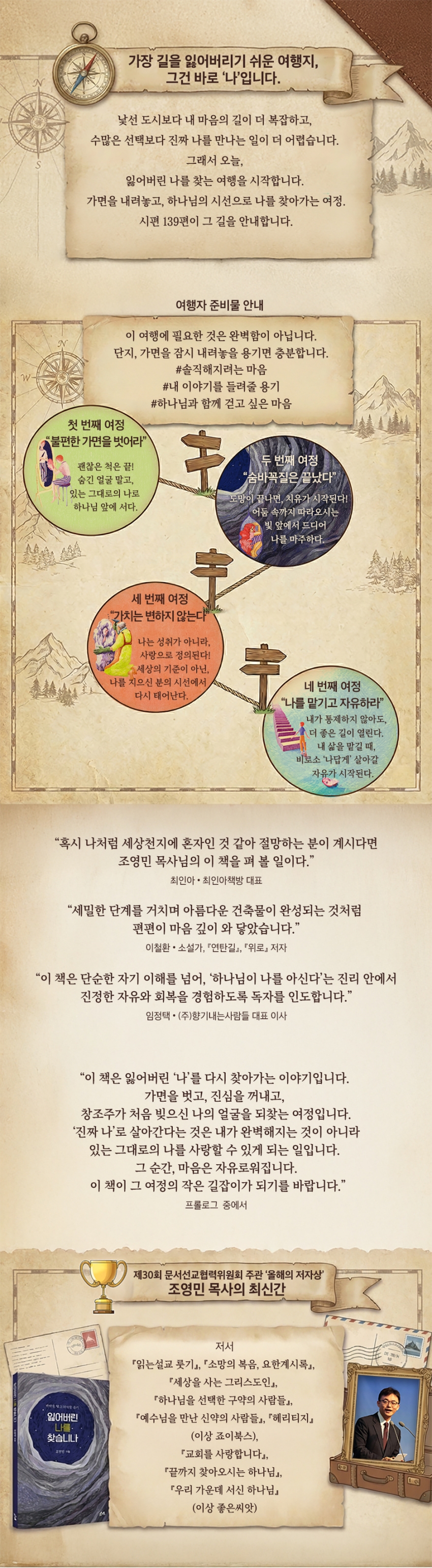 저자는 오랜 시간 사람들의 마음을 가까이에서 지켜본 목회자로, 이 책에서 사람이 스스로를 잃어버리는 이유를 “잘못된 시선”이라고 말한다. 세상은 끊임없이 나를 평가하고 비교하고 조급하게 만들지만, 하나님이 보시는 나는 그 어떤 기준에도 휘둘리지 않는 ‘존재 자체의 가치’를 지닌다. 이 책은 시편 139편을 네 부분으로 나누어 나를 찾아 떠나는 4번의 여정으로 구성해, 독자가 단계적으로 자신을 다시 발견하도록 돕는다.