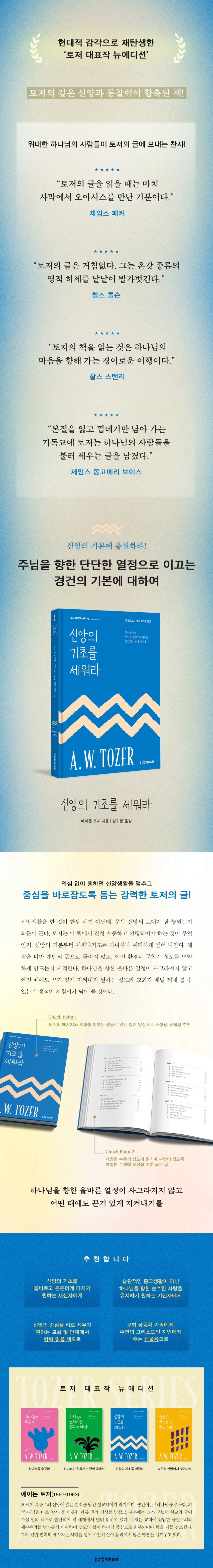 생명의말씀사가 오랜 시간 독자들에게 사랑받아 온 에이든 토저의 주요 저작을 ‘토저 대표작 뉴에디션’으로 새롭게 선보인다. 이번 시리즈는 본질을 꿰뚫는 토저의 통찰이 다양한 세대의 더 많은 사람에게 닿기를 바라는 마음으로 기획되었다. 표지는 생동감 있는 컬러 양장으로 제작하여, 토저의 메시지가 지닌 특유의 에너지를 시각적으로 담아냈다. 글도 최대한 읽기 쉽게 다듬어 가독성을 높였다. 현대적 감각으로 재탄생한 이 시리즈를 통해 독자들이 급류와 같은 세상에서 오롯이 하나님만 바라보는 그리스도인으로 세워지기를 바란다.
