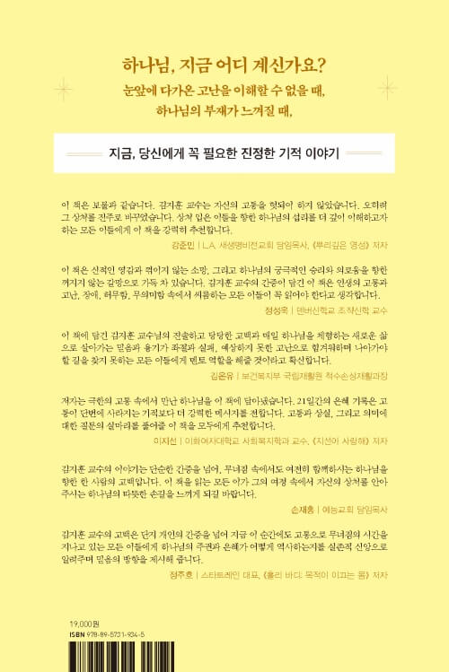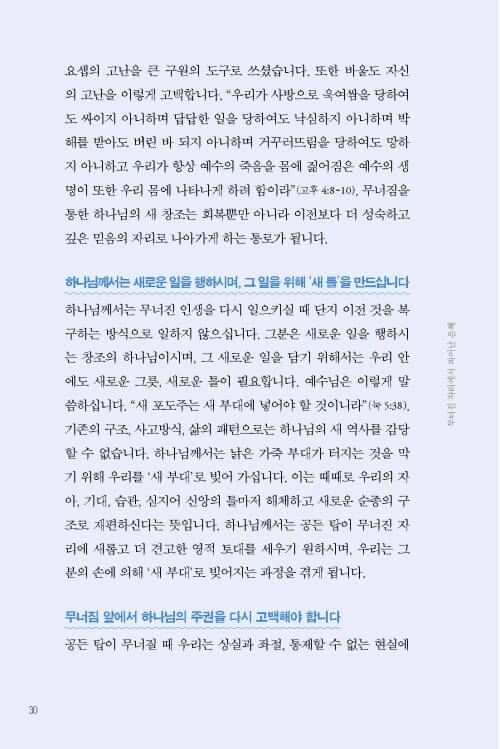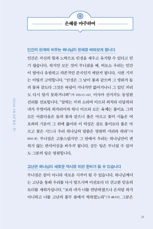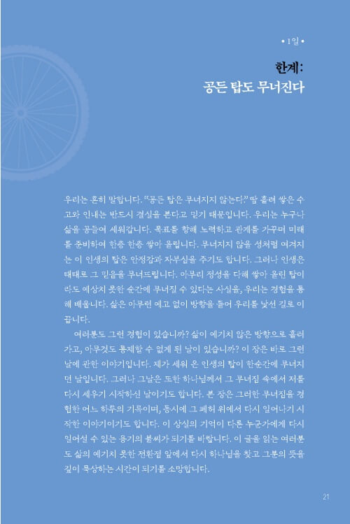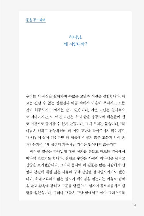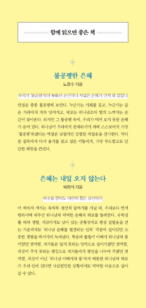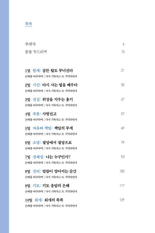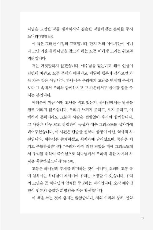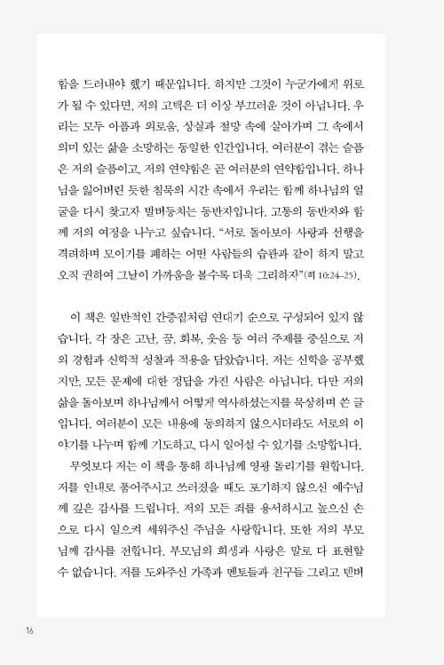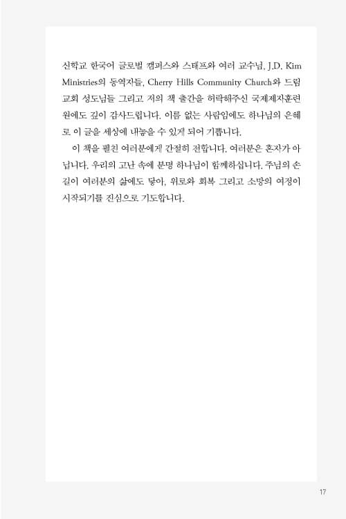 저자는 자신의 삶을 녹아낸 이야기와 함께, 그 속에서 몸소 느끼고 깨달은 묵상을 정리하여 독자가 21일 동안 따라 걸을 수 있는 내용을 이 책에 담았다. 그리하여 인생의 고통 가운데 있을지라도 늘 곁에 계신 주님을 붙잡을 수 있기를, 그리고 우리의 고난은 하나님의 부재가 아닌 임재를 증명하는 자리임을 깨닫게 되기를 바라는 마음을 녹여냈다. 바라기는 이 책을 읽는 모든 독자가 21일 동안 함께 걸으며 주님 앞에 한 걸음 한 걸음 나아가고 그분이 부어주시는 풍성한 위로와 평안과 소망을 누리기를 간절히 소망한다.