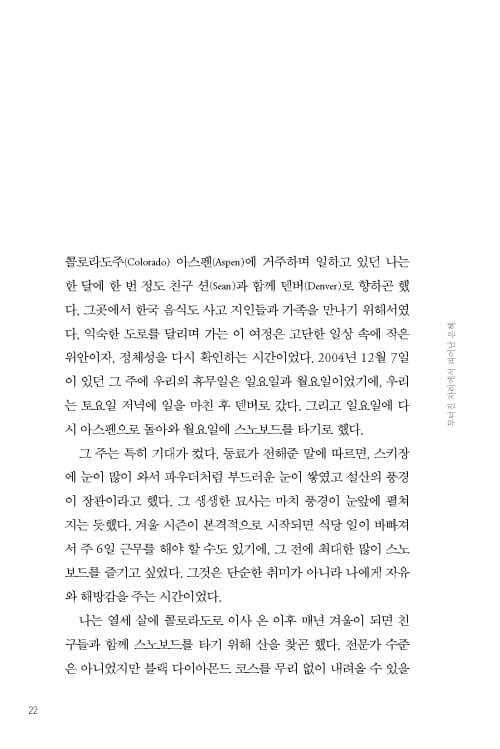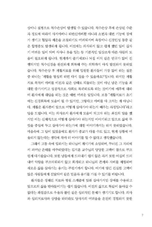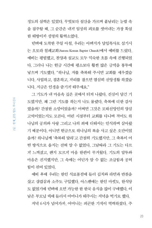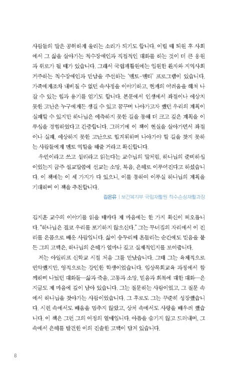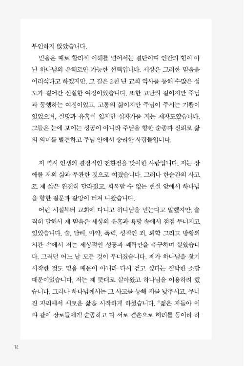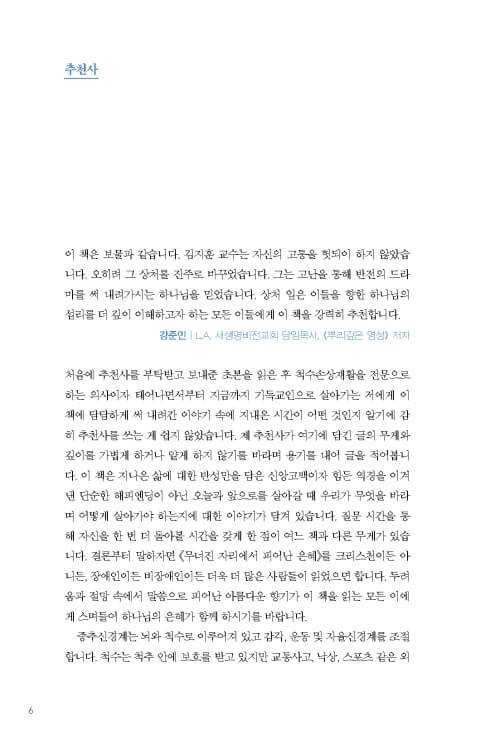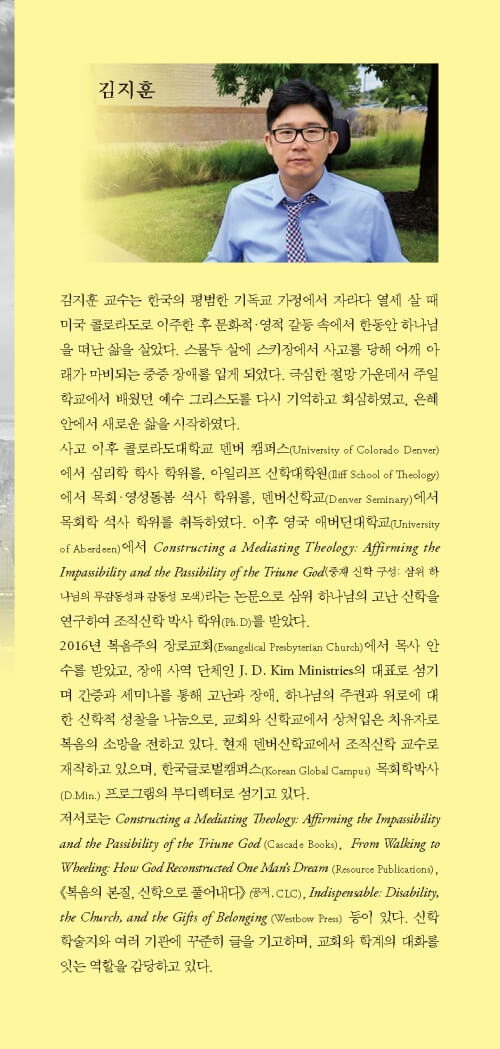 저자도 그런 광야 속에서 몸부림치는 날들을 경험했다. 어린 시절 정착한 미국 땅에서 오랜 방황을 겪던 그는 주님과 멀어진 채 일식 셰프라는 부푼 꿈을 안고 인생의 성공을 위해 고군분투했다. 그러던 어느 날 생각지 못한 불의의 사고로 하루아침에 휠체어를 타게 된 그는 인생의 계획과 함께 무너져 버렸다. 그렇게 모든 것이 끝나는 것이 더 좋을지도 모른다고 생각한 그때, 저자는 어릴 적 들었던 하나님이 떠올렸다. 지식 속에 머물러 있는 분이었지만 그 순간만큼은 그분 밖에 의지할 존재가 없었다. 그리고 그 의지가 자신을 다시 걷게 할 기적이 될지도 모른다는 희망도 주었다. 그때부터였다. 저자는 주님과의 동행을 시작하게 되었다. 주님을 온전히 알아가며 그분을 사랑하는 여정이 시작된 것이다. 비록 두 발로 다시 걷는 기적은 일어나지 않았지만, 주님을 만나고 주님과 함께 한 걸음 한 걸음 걸어가는 영적 동행을 하게 되었다. 저자는 이것이 자신의 바람을 넘어선 더 큰 기적이었음을 이 책을 통해 고백한다.
