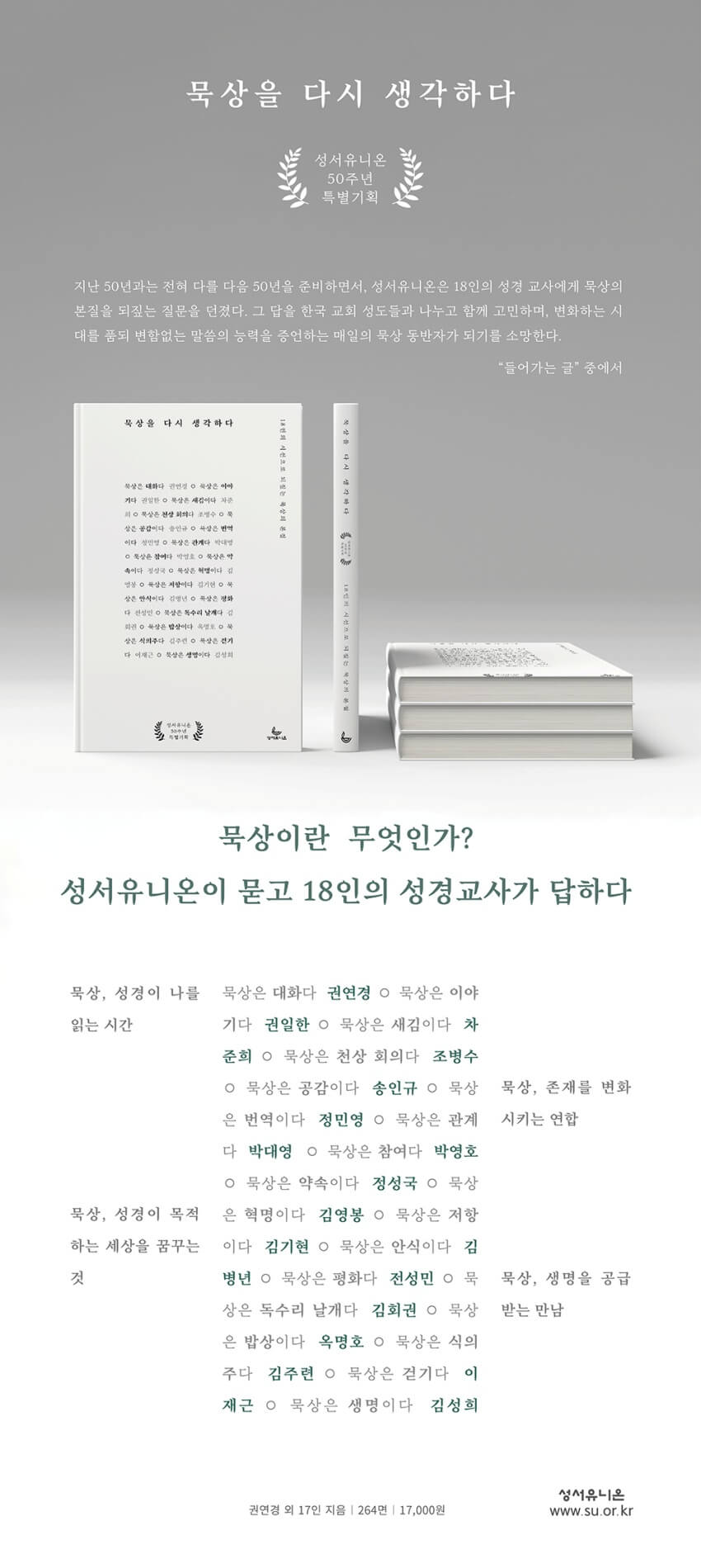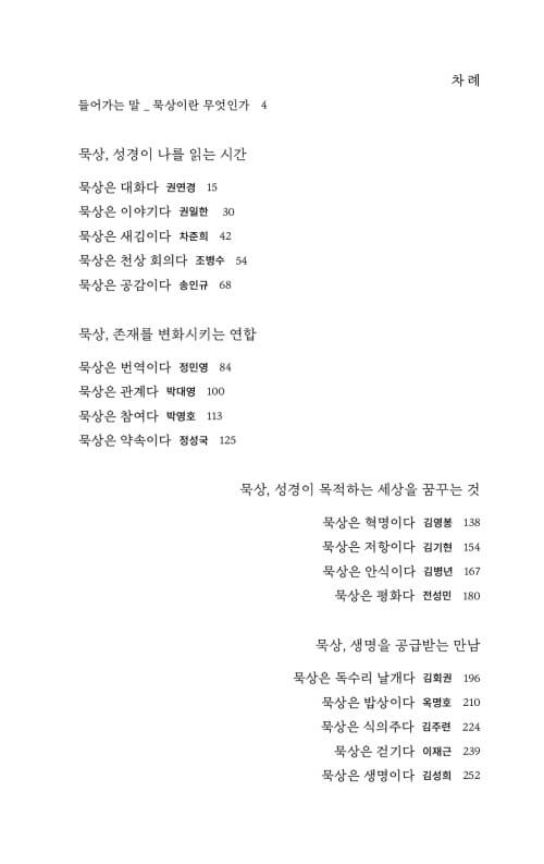 한국 교회의 각 분야를 대표하는 성경 교사들이 이 제안에 응해 주셨고, 『다시 묵상을 생각하다』라는 표제 아래 18인의 저자가 전하는 묵상에 관한 다채롭고 날카로운 생각들이 모였다. ‘독수리 날개’다(김회권, 숭실대 기독교학과), ‘번역’이다(정민영, 전 국제위클리프 부대표), ‘천상 회의’다(조병수, 합신대학원 전 총장), ‘혁명’이다(김영봉, 와싱톤사귐의교회), ‘새김’이다(차준희, 한세대 구약학), ‘참여’다(박영호, 포항제일교회), ‘대화’다(권연경, 숭실대 기독교학과), ‘안식’이다(김병년, 다드림교회), ‘저항’이다(김기현, 로고스교회), ‘평화’다(전성민, 밴쿠버기독교세계관대학원)….