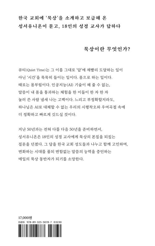 1973년 한국 교회 첫 큐티집 「매일성경」을 출간하고 묵상 운동 한 길만을 걸어온 한국성서유니온선교회가 물었다. “묵상이란 무엇인가?” 독수리 날개다(김회권), 혁명이다(김영봉), 새김이다(차준희), 참여다(박영호), 대화다(권연경), 안식이다(김병년), 저항이다(김기현), 평화다(전성민) 등 18인의 생각을 모았다. 큐티의 명과 암에 대해 귀담아들으며 ‘묵상의 바른 기준’을 제시하려 힘써 온 성서유니온은, 다음 50년을 향해 발걸음을 내디디며 이 책을 통해 ‘Quiet Time’이 얼마나 다채롭고 충만한 시간인지 나누려 한다.